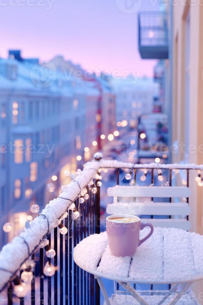 Snowy city balcony at night adorned with glowing string lights, featuring a cozy cup on a table, creating a warm and inviting winter atmosphere with copy space Pro Photo