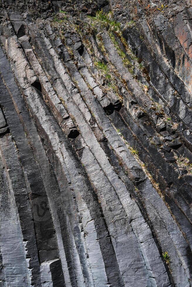 Steep basalt columns with sharp hexagonal edges rise on a cliff in Iceland. Natural directional light reveals mineral lines and sparse plants in tight composition. Pro Photo