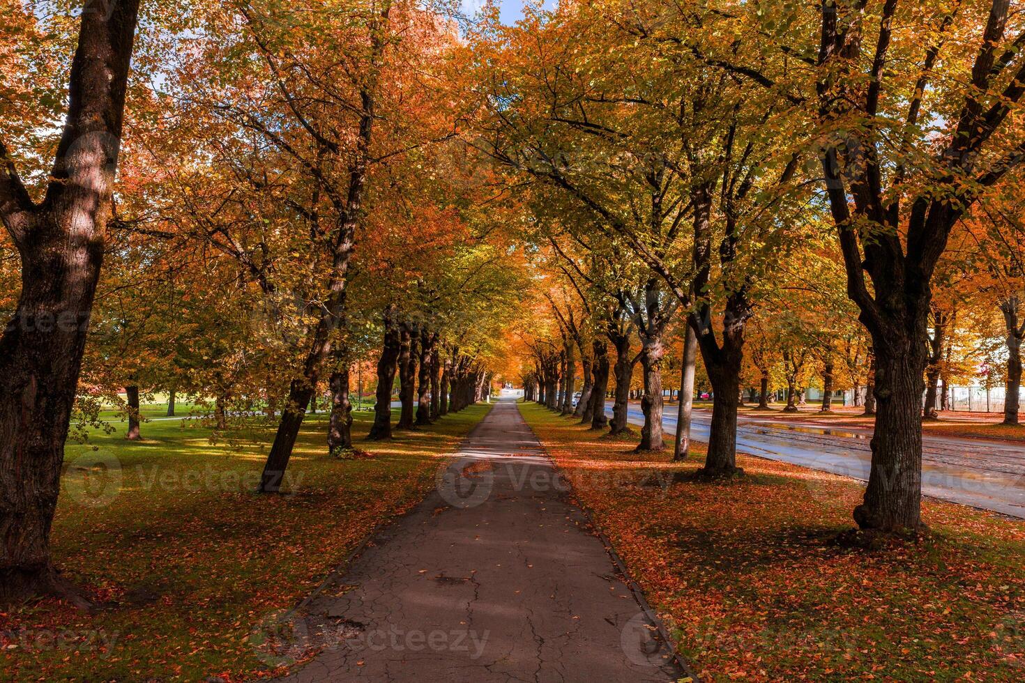 A tree lined path in a Riga park extends toward a vanishing point, rows of autumn trees glow, a roadway runs at right, late afternoon light casts dappled patterns Pro Photo