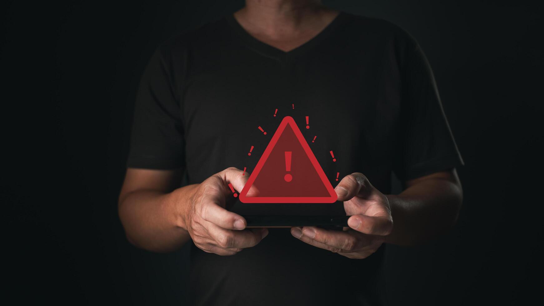 A smartphone user receives a caution notification as a glowing red warning symbol appears, indicating a potential error or alert in the digital system. photo