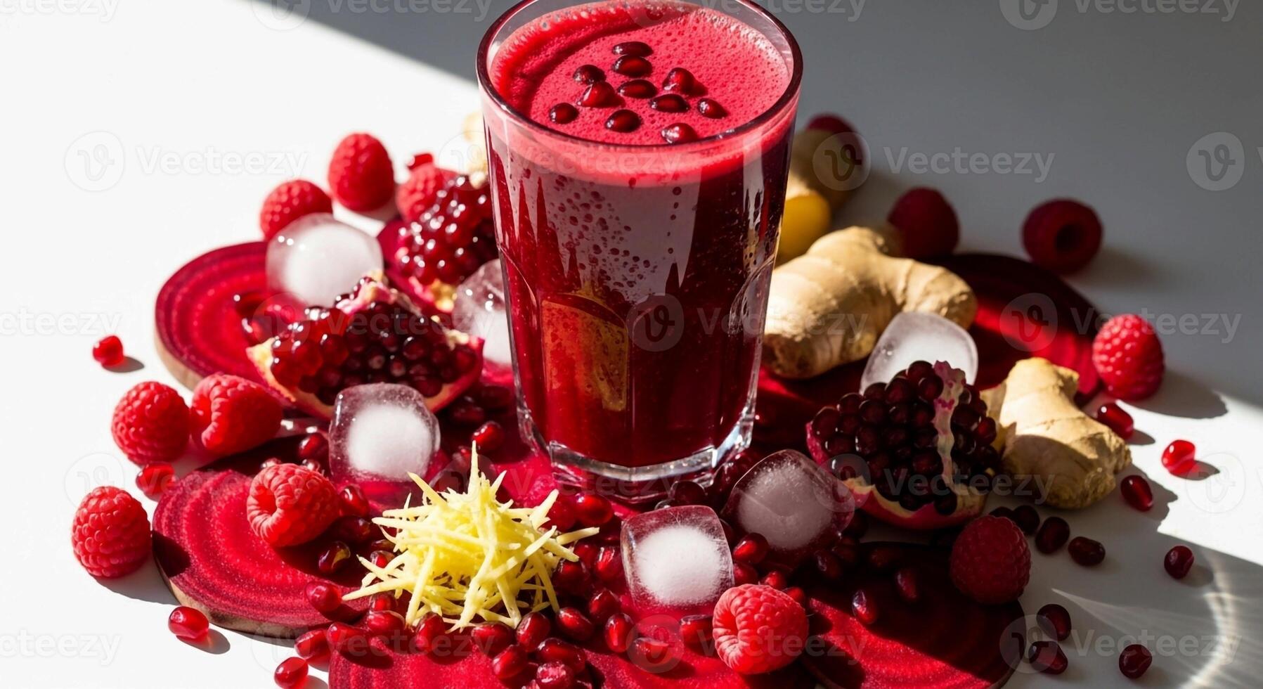 Vibrant ruby red smoothie featuring fresh raspberries pomegranate seeds sliced beets and ginger root artfully arranged with ice cubes Pro Photo