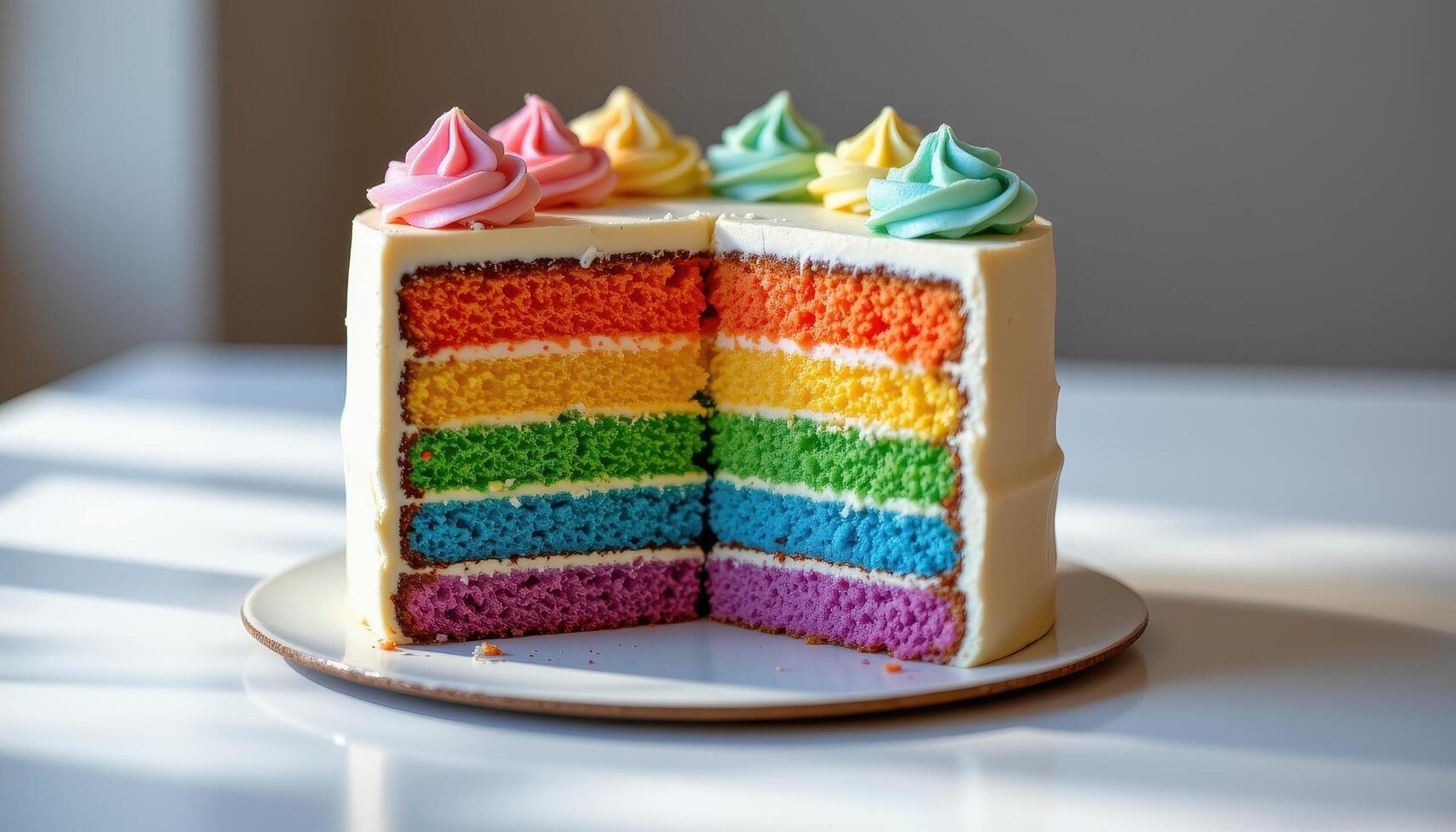 A rainbow layer cake adorned with pastel frosting peaks, resting elegantly on a reflective surface softly glowing in diffused light. Free Photo