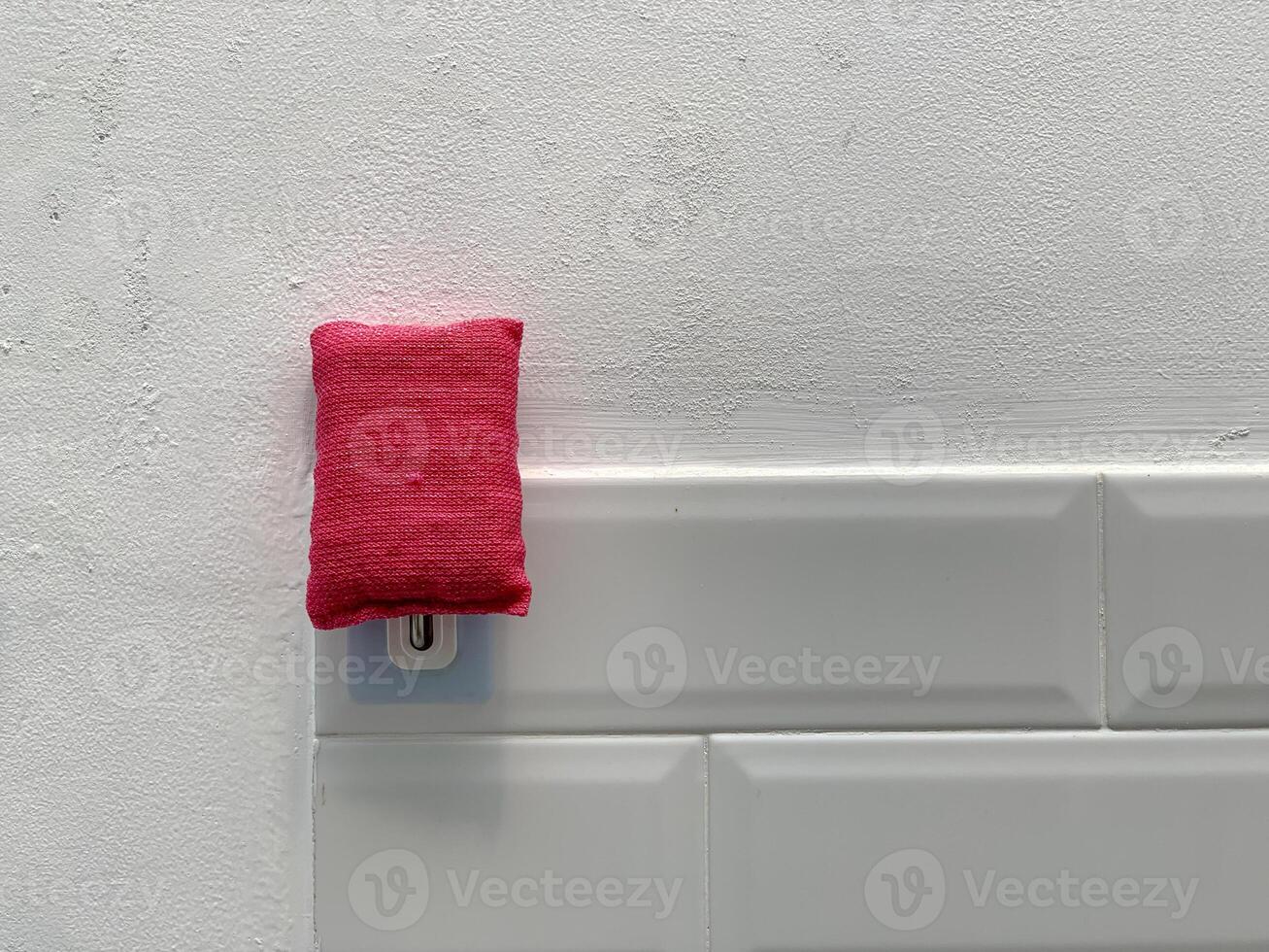 Red rectangular object on a white tiled wall, minimalist and clean design. Pro Photo