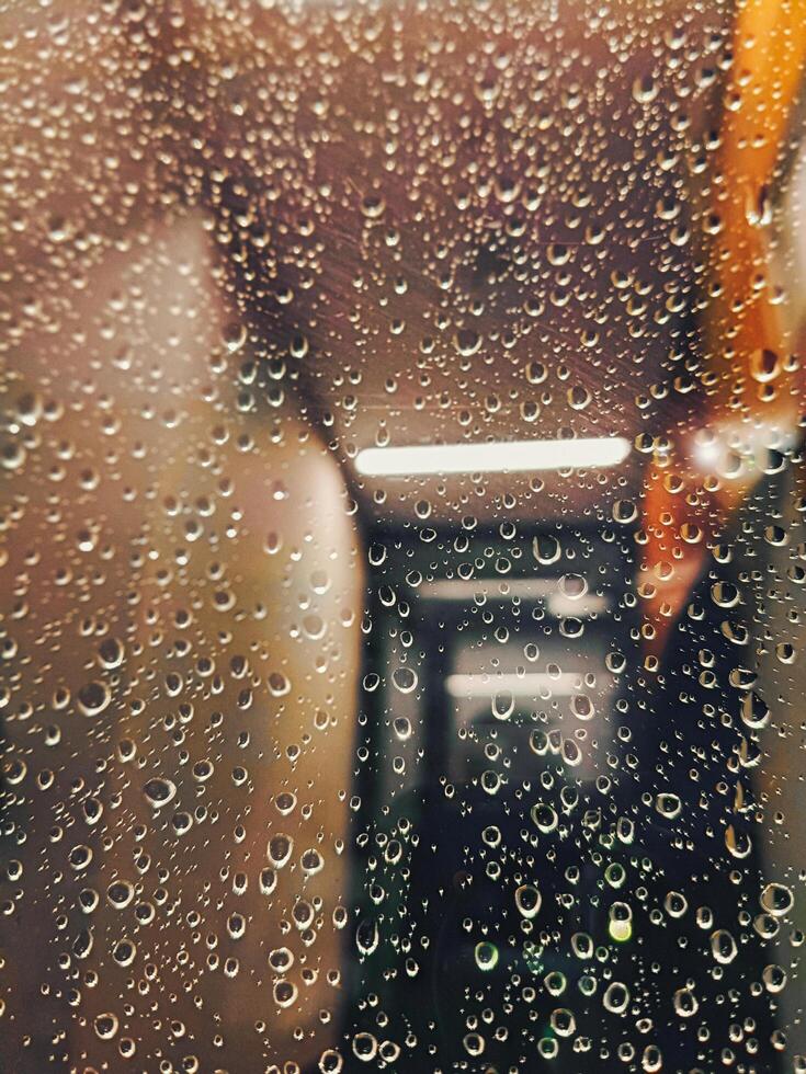 Raindrops clinging to a glass window, creating a soft, textured effect with blurred indoor lighting in the background. reflecting blurred orange and gray hues of passing scenery. photo