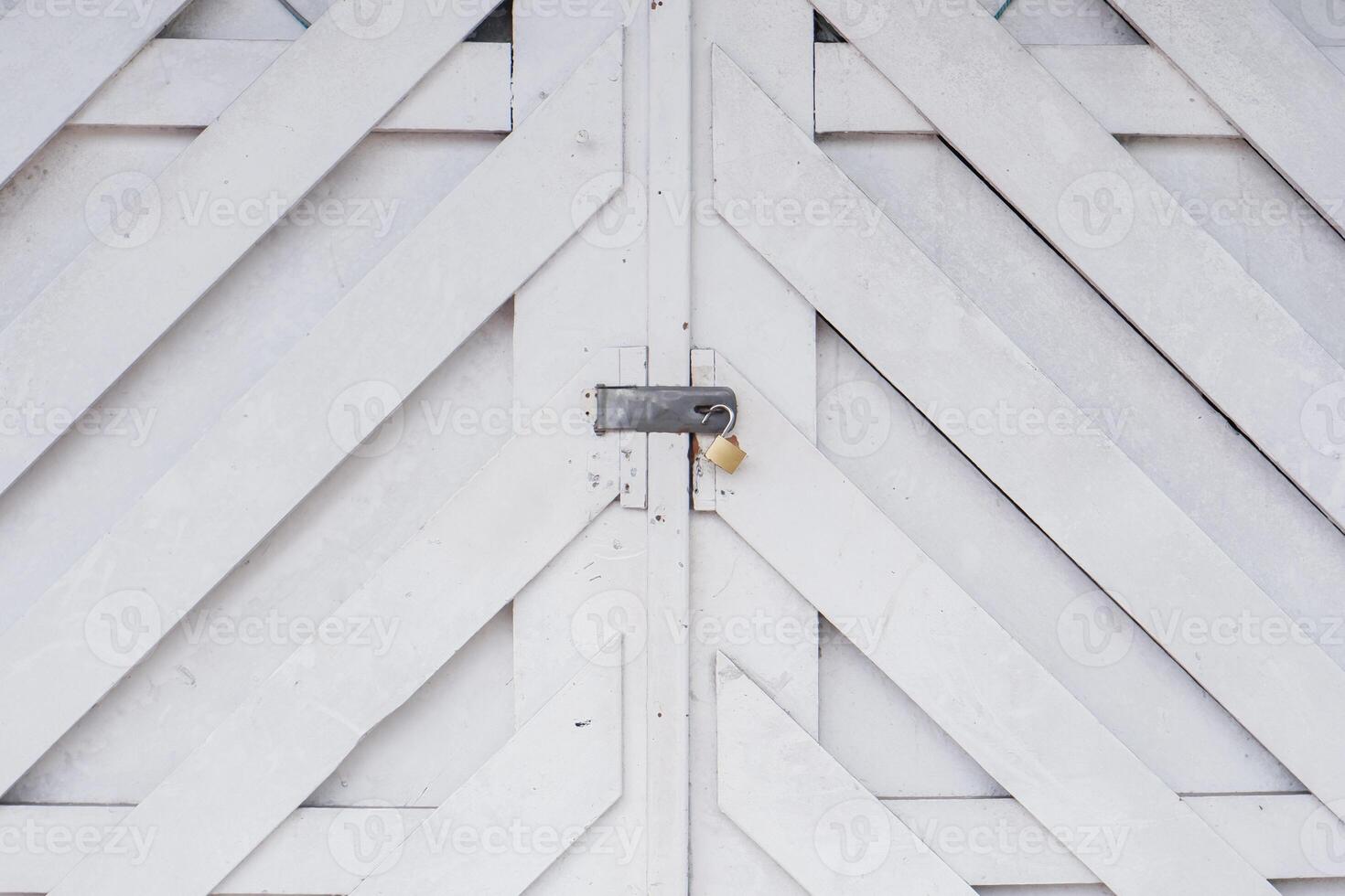 White wooden double door with diagonal plank pattern and metal latch, creating a rustic geometric texture background perfect for architecture or design concepts. Pro Photo