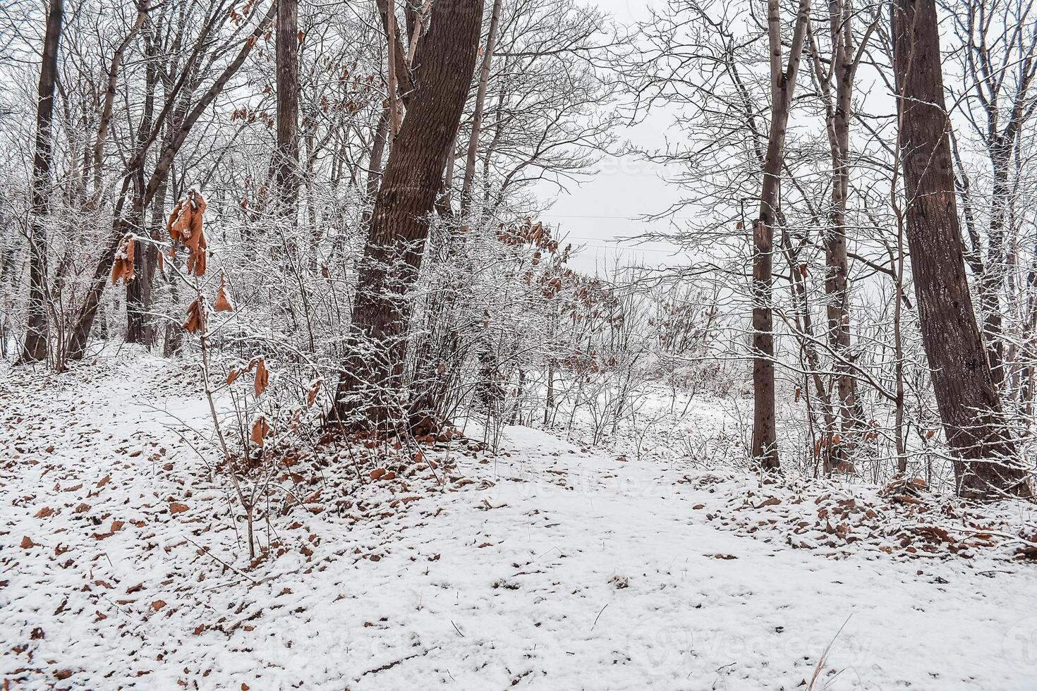The park is covered with a thin layer of snow in winter. . The park with tall trees and paths is covered with snow. Pro Photo