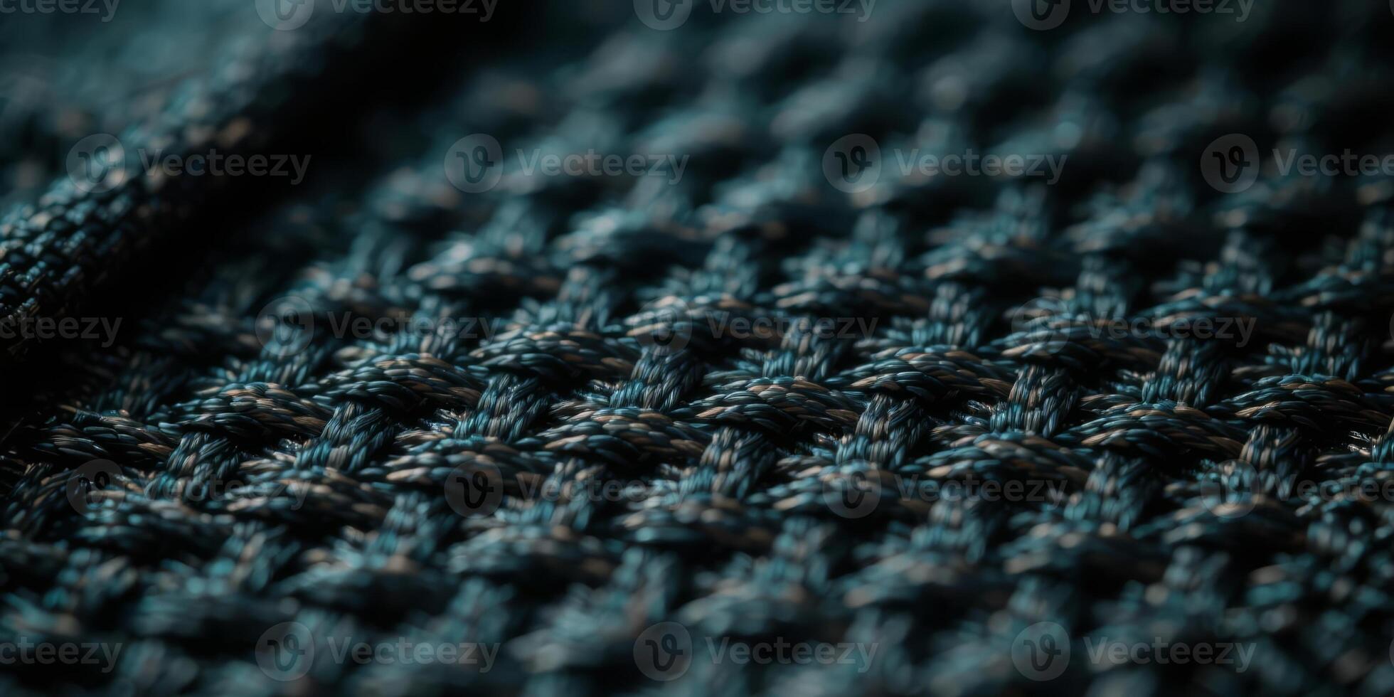 Macro detail of a coarsely woven synthetic fabric in dark teal and black. Repeating knit pattern with sharp focus and subtle texture Pro Photo
