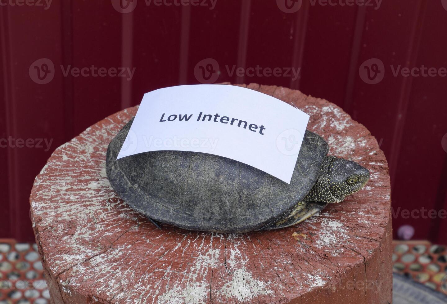 Low internet. A bad internet symbol. Low download speed. Slow internet. Ohrdinary river tortoise of temperate latitudes. The tortoise is an ancient reptile. Pro Photo