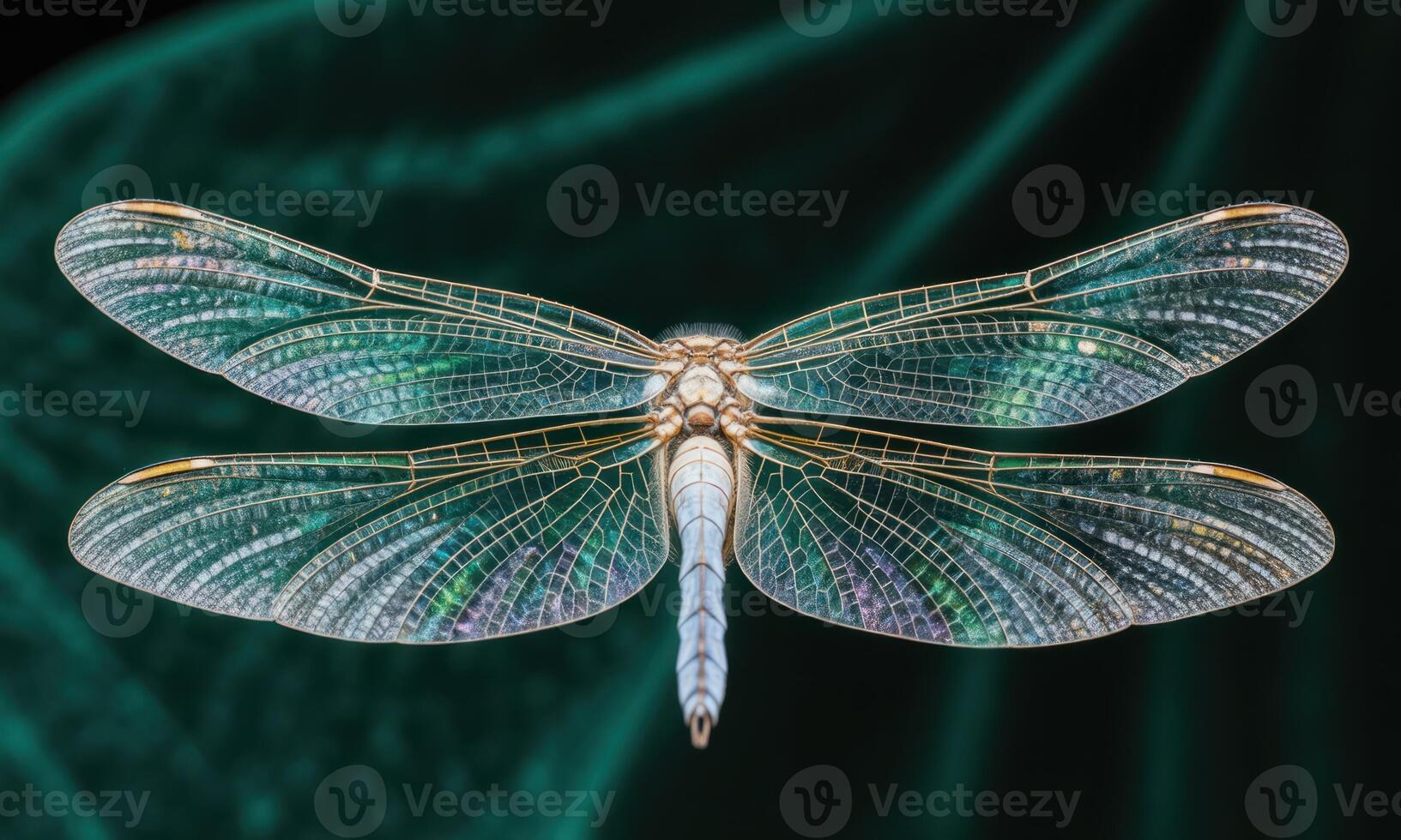 Hyper realistic macro photograph of a delicate dragonfly with translucent iridescent wings Pro Photo