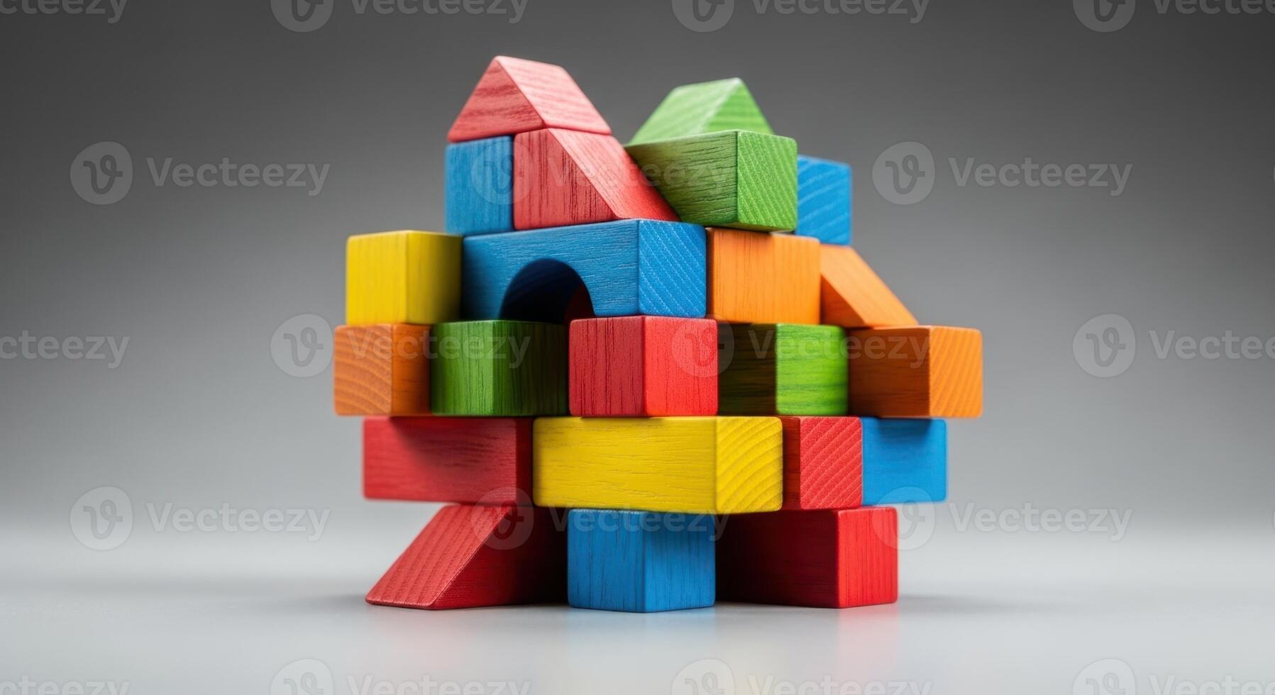 Vibrant wooden building blocks in various shapes stacked, forming an abstract structure. Pro Photo