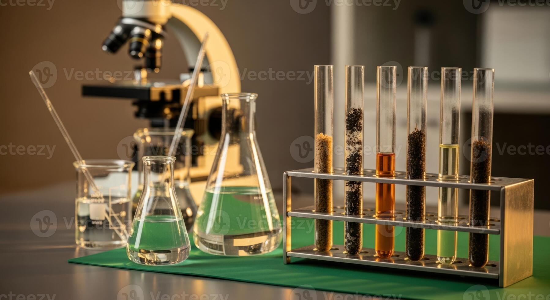 Professional science lab setup with microscope, beakers, flasks, and test tubes on a green mat Pro Photo