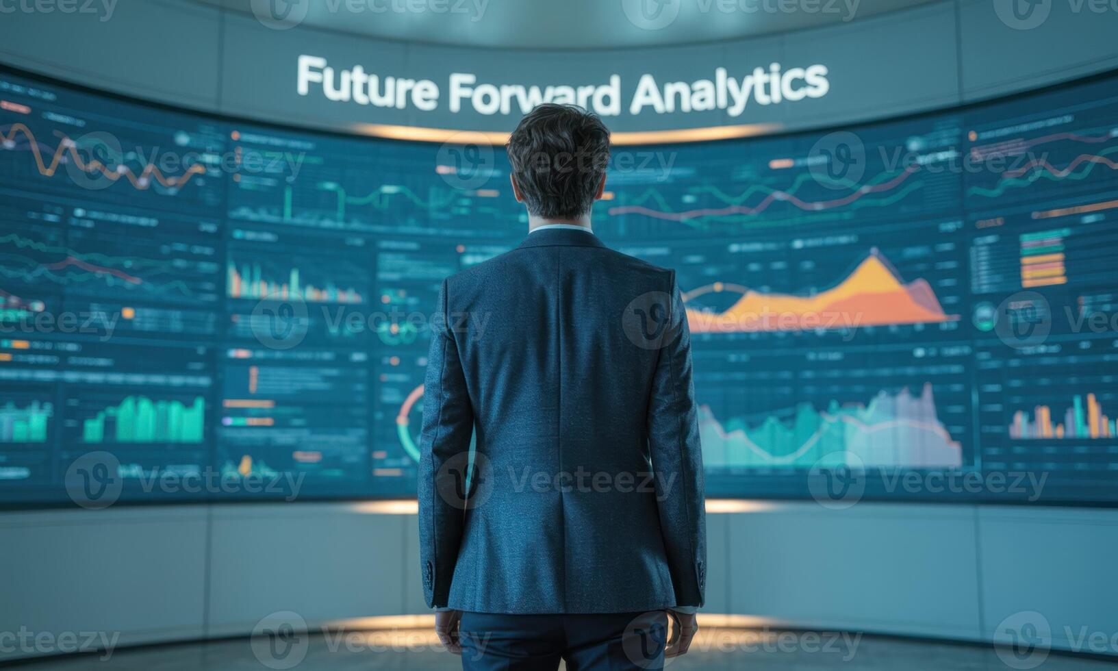 Businessman in suit analyzing future forward analytics on a large digital data wall Pro Photo