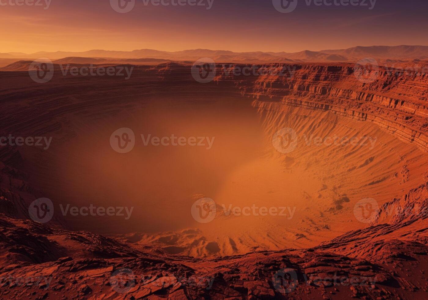 Dramatic view of a colossal ancient caldera on a mars like alien planet surface Pro Photo
