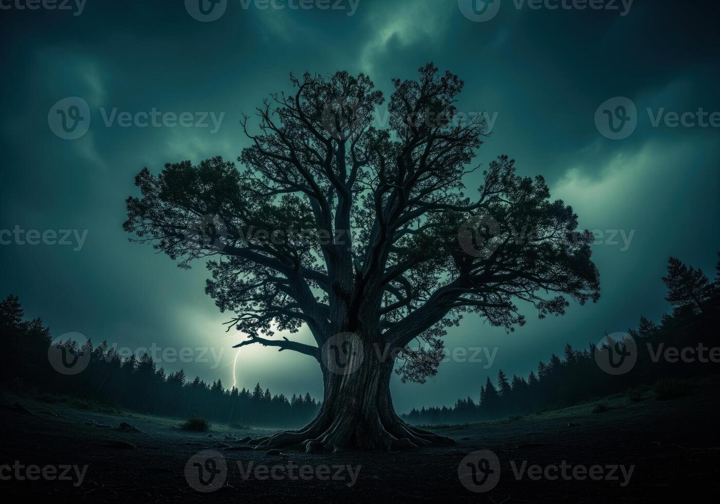 Epic view of a towering sentinel tree during a violent thunderstorm with lightning Pro Photo