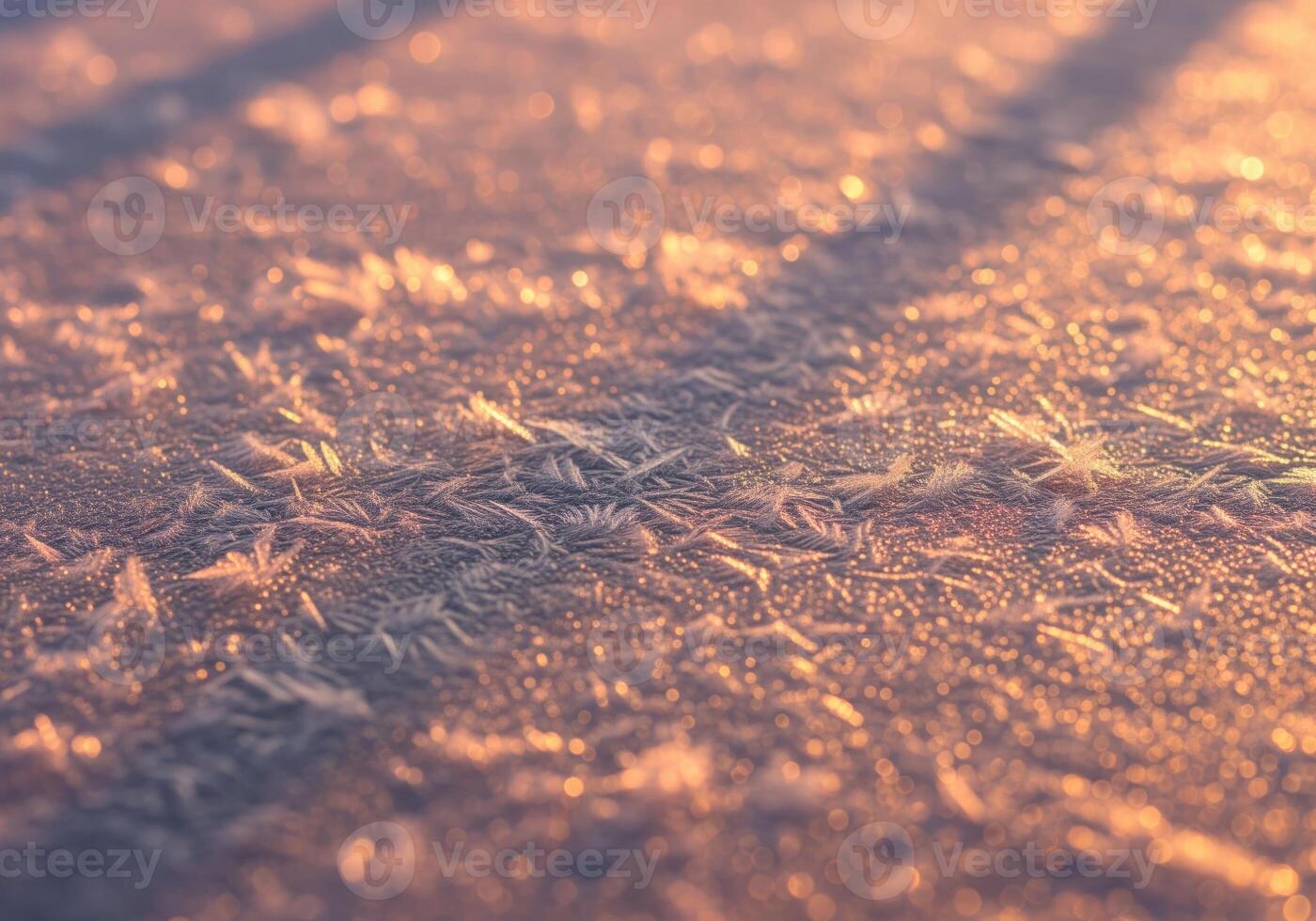 Delicate ice frost crystals texture illuminated by warm golden hour light and bokeh Pro Photo