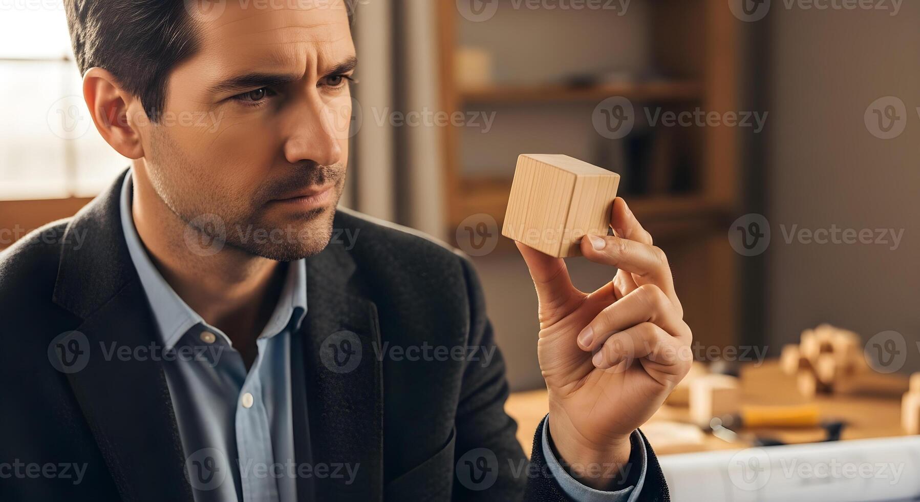 Architect analyzing wooden block, conceptual design, business, and architecture concepts. Pro Photo