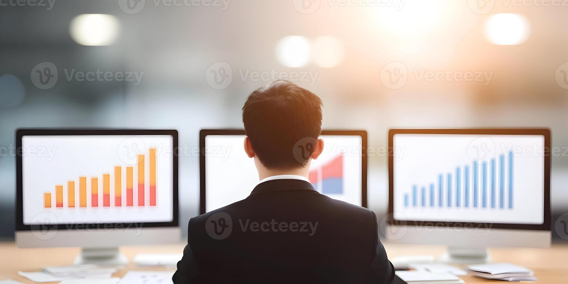 A professional from behind analyzes business data on multiple computer screens in an office environment Pro Photo
