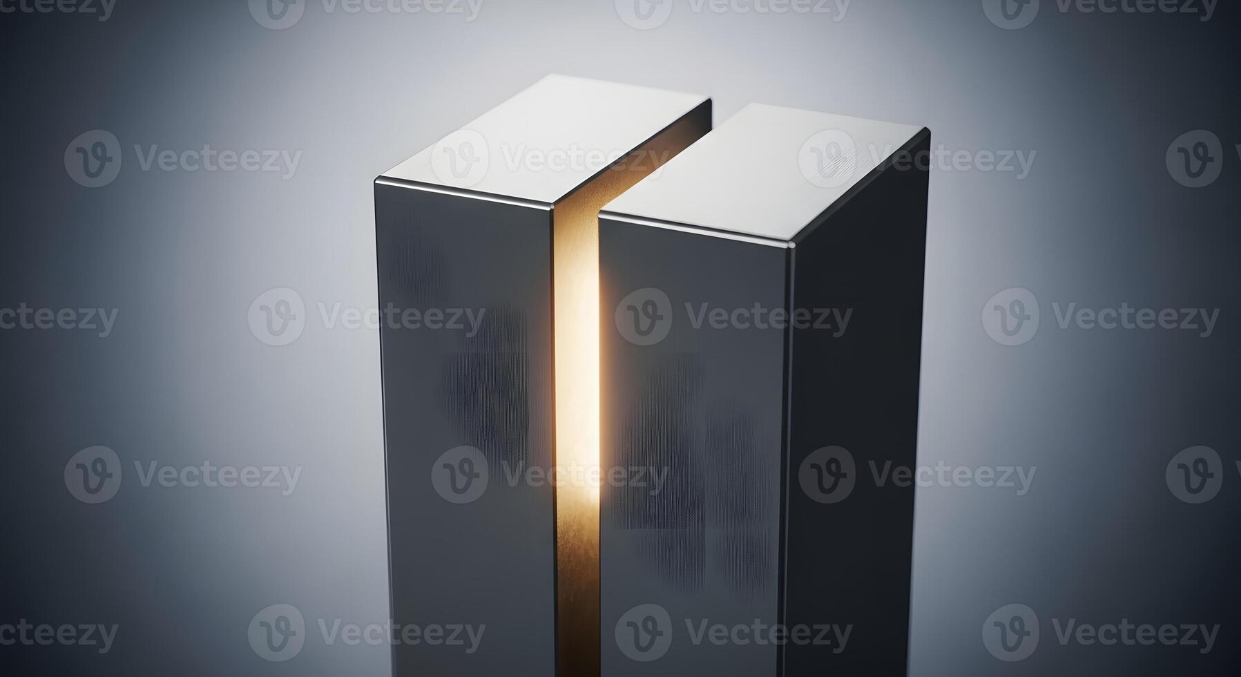 Abstract 3D rendering of two vertical metallic rectangular blocks, with a light source glowing between them Pro Photo