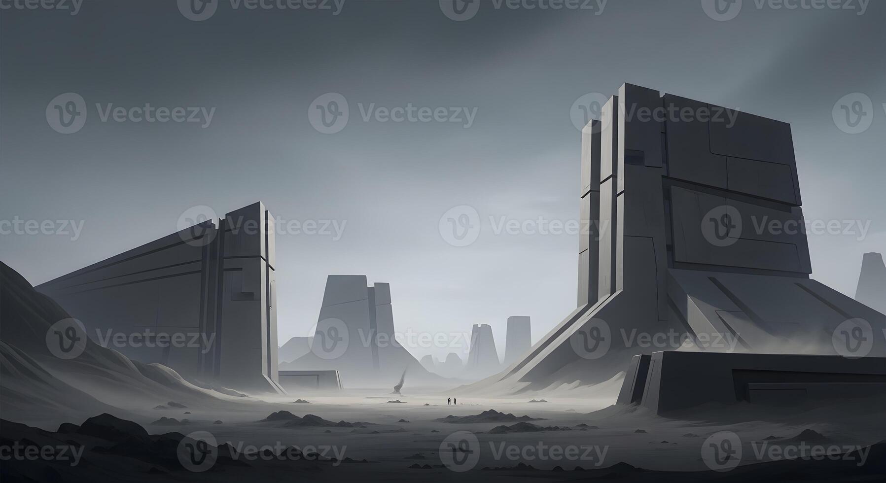 Vast alien landscape with imposing monolithic structures under a hazy sky, suggesting a desolate and futuristic civilization Pro Photo