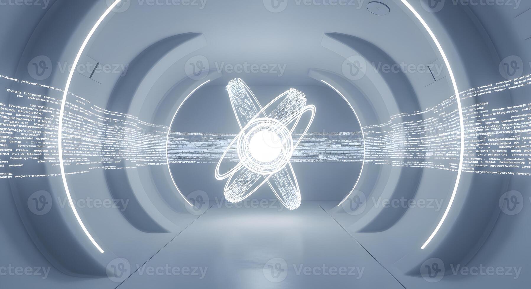 Sleek illuminated passage with a glowing atomic model at its core, surrounded by streams of digital information, signifying the convergence of science and advanced technology Pro Photo