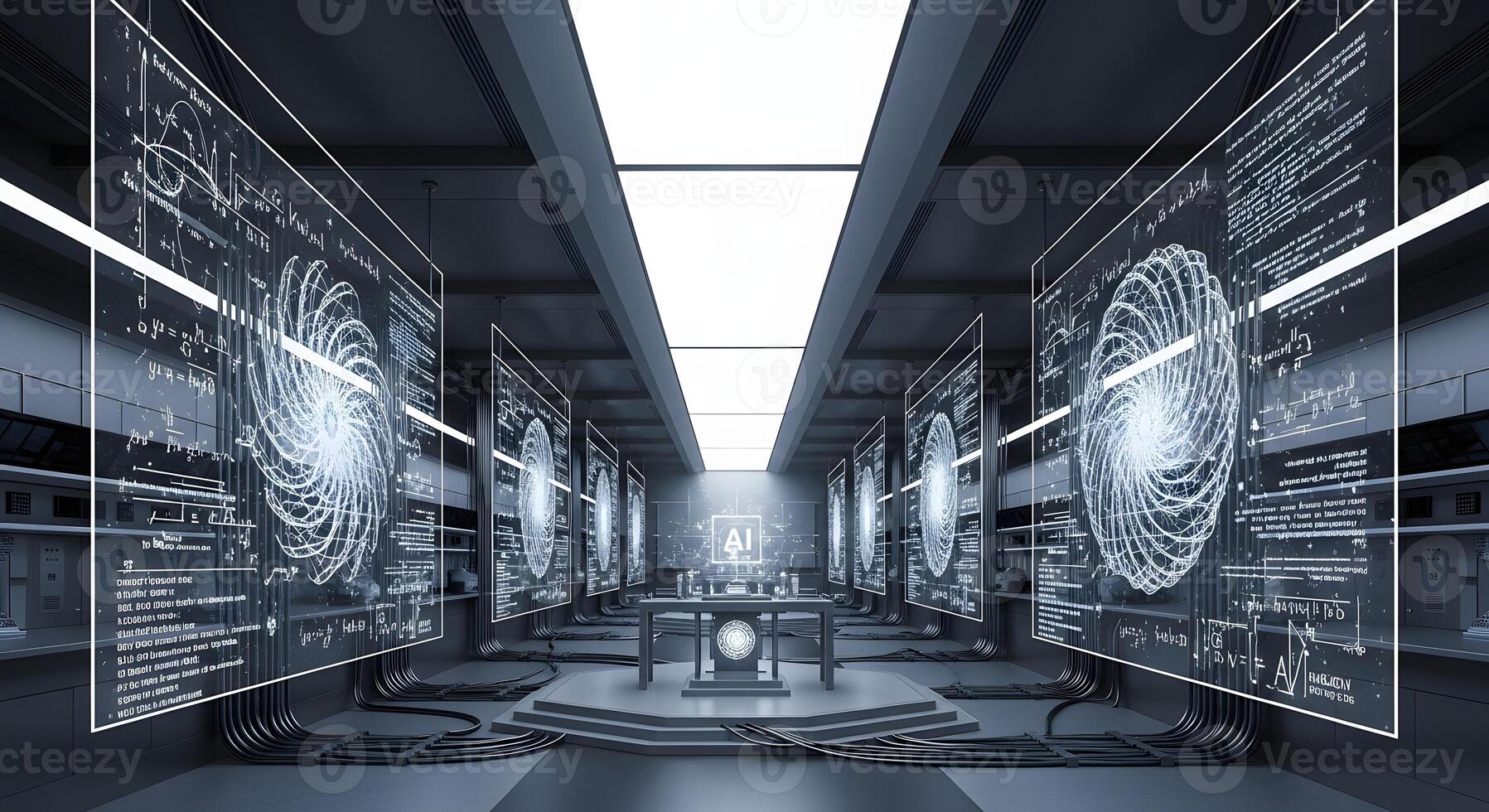 Futuristic AI research facility with holographic displays visualizing complex algorithms and scientific data, symbolizing innovation in machine learning and advanced computing technology Pro Photo