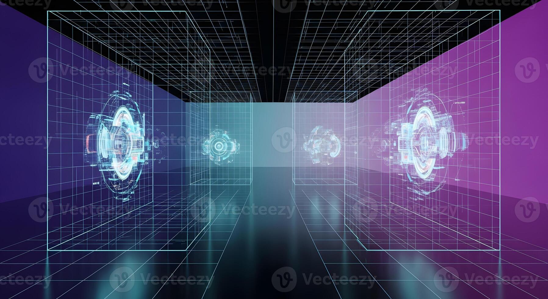 Dynamic futuristic digital interface with intricate holographic data visualizations within a glowing grid network, representing advanced technology and virtual reality concepts Pro Photo