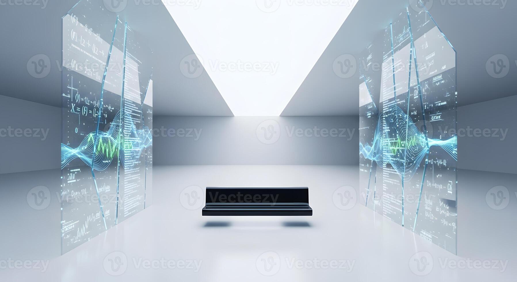 Futuristic white space with transparent digital screens showing complex data, graphs, and algorithms, representing advanced technology, artificial intelligence, and scientific innovation Pro Photo