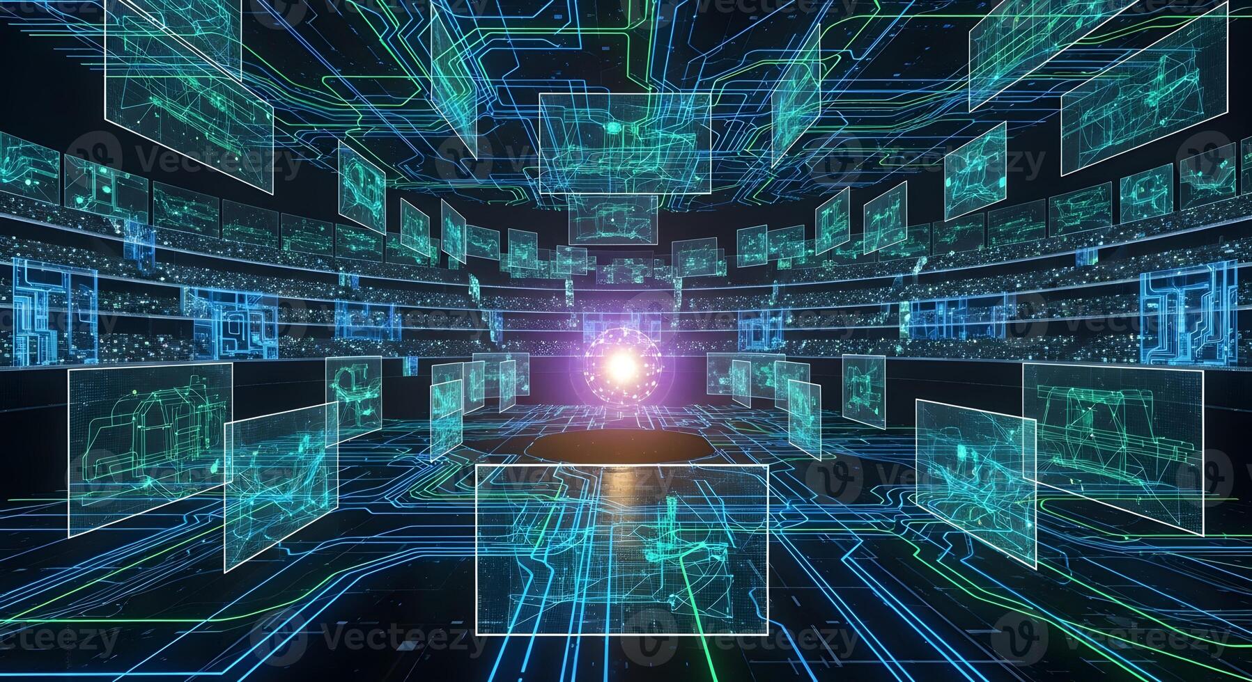 Futuristic Digital Arena with Glowing Circuits and Data Displays, Representing Advanced Technology, Artificial Intelligence, and Interconnected Networks in a Virtual Space Pro Photo