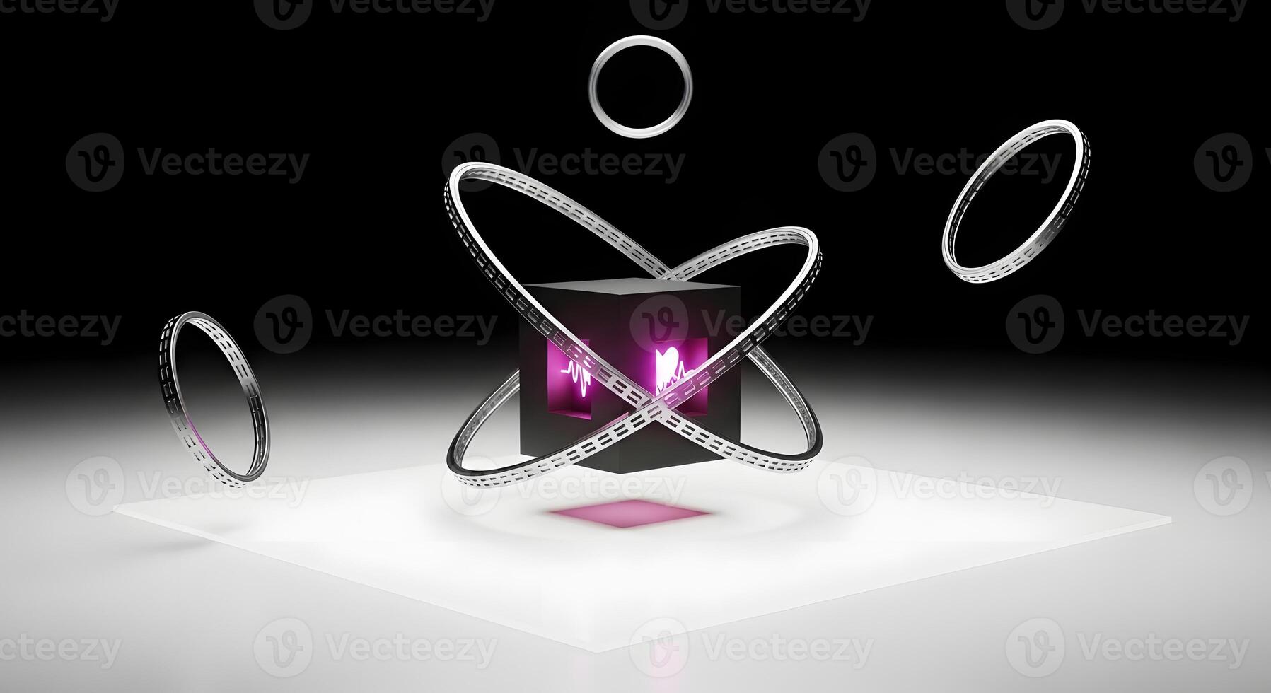 Abstract 3D rendering of a geometric cube with surrounding rings, futuristic design Pro Photo