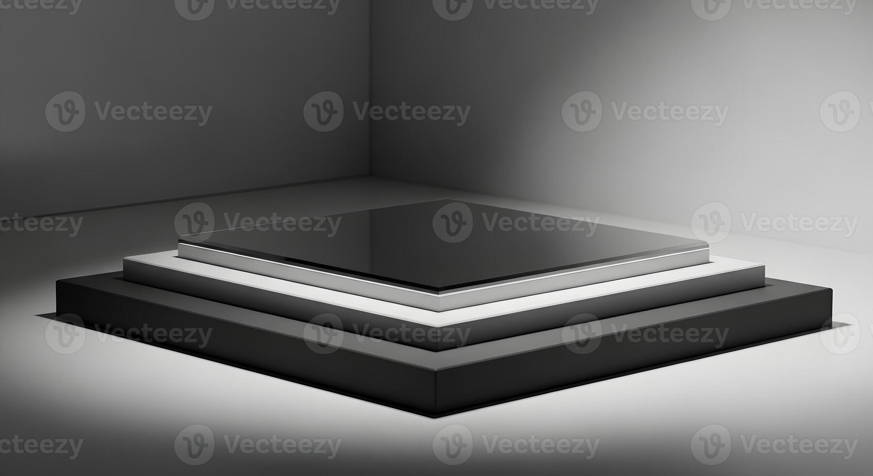 Minimalist abstract display stand with multiple square layers culminating in a glossy dark top, illuminated within a clean, conceptual space Pro Photo