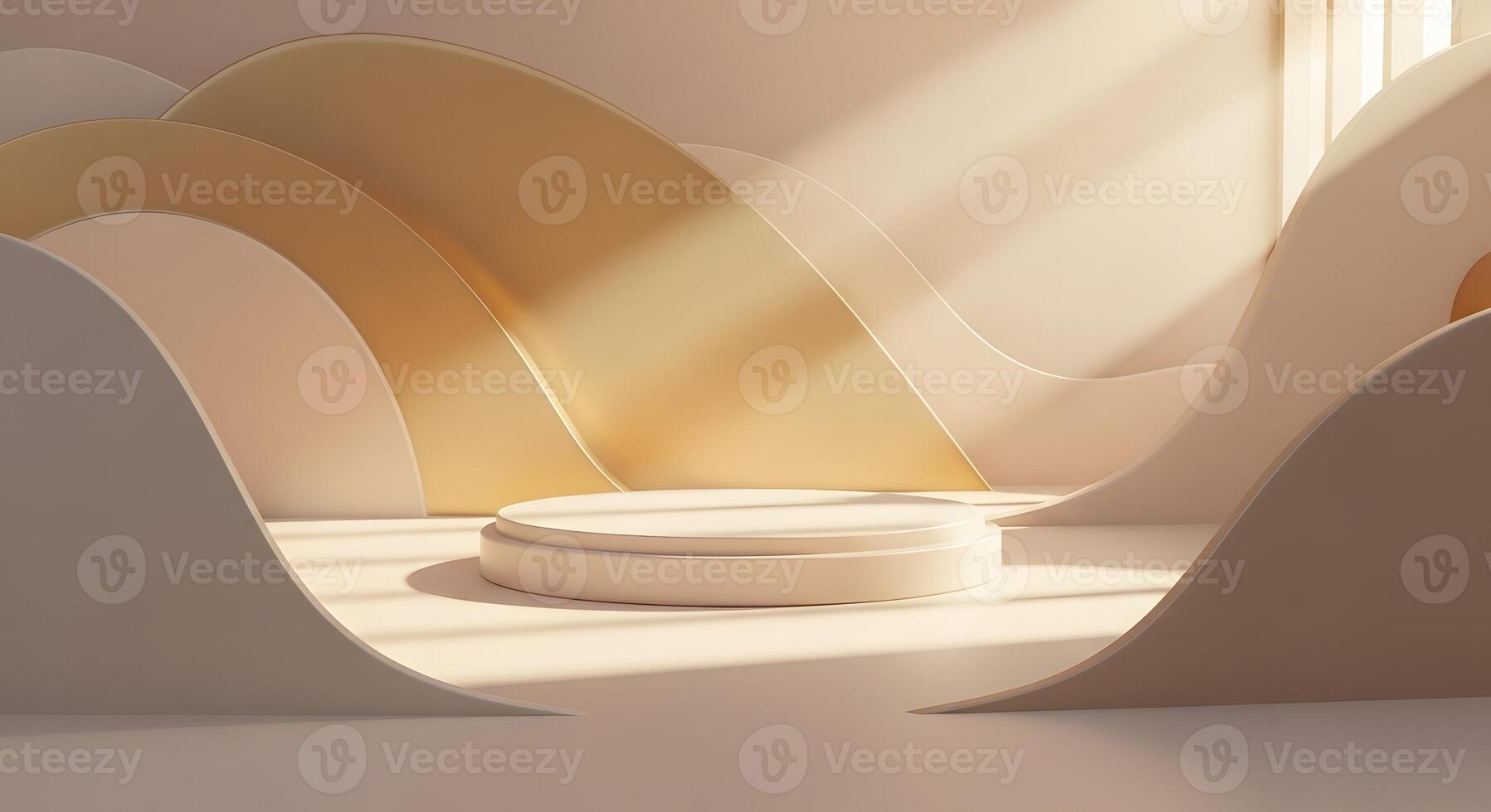 Graceful 3D architectural render with a central display plinth, undulating warm-toned forms, and dappled sunlight, creating a sophisticated product promotion setting Pro Photo