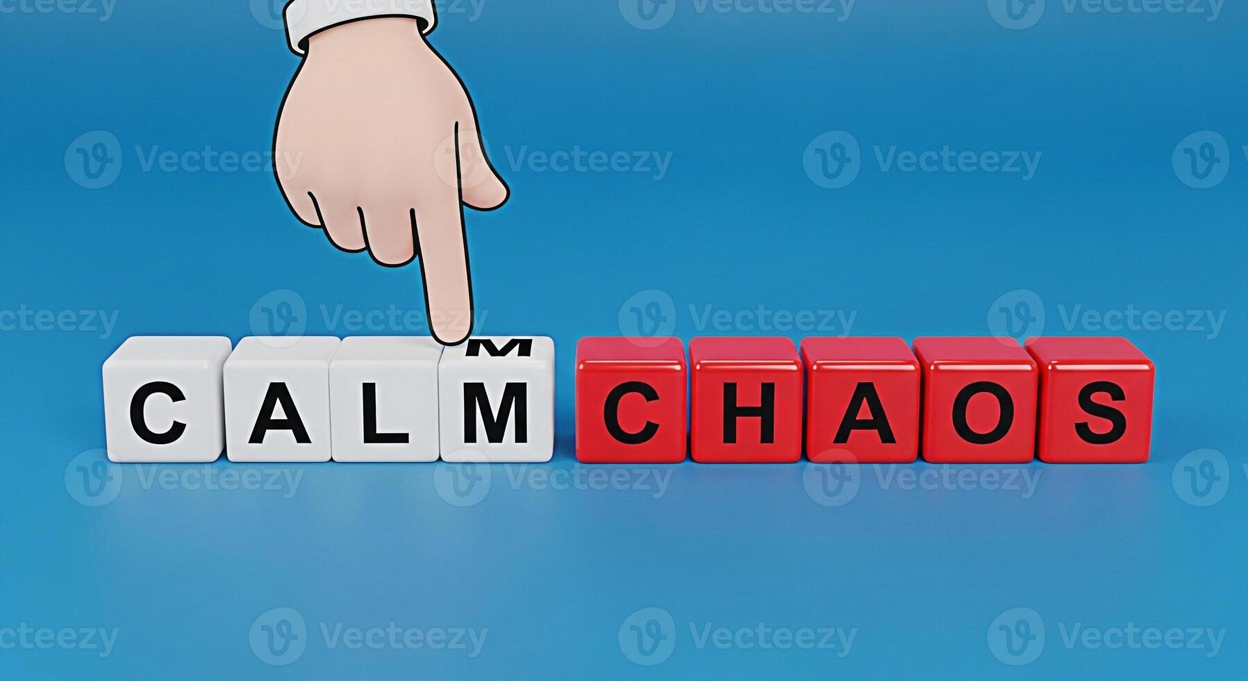 Cartoon hand transforming the word chaos into calm by flipping a letter on alphabet blocks against a blue background symbolizing peace control and the transition from disorder to tranquility in a simp Pro Photo