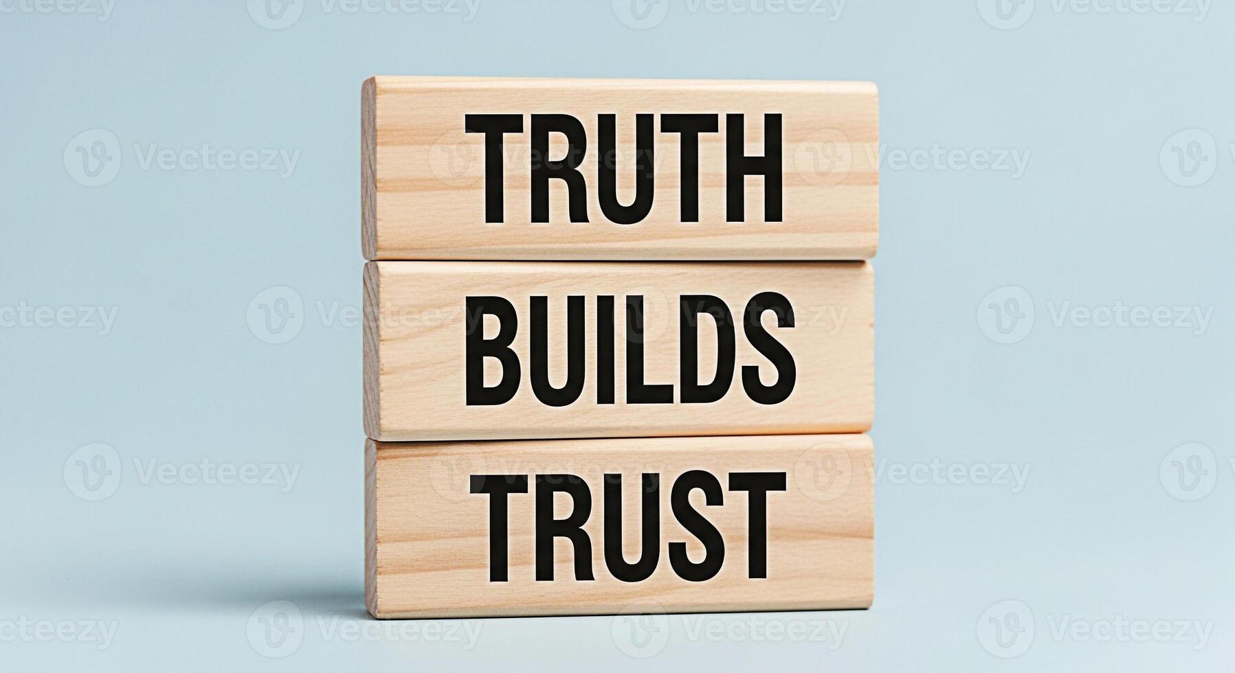 Stacked wooden blocks displaying the message Truth Builds Trust on a light blue background symbolizing honesty integrity and the importance of building strong relationships based on transparency and r Pro Photo