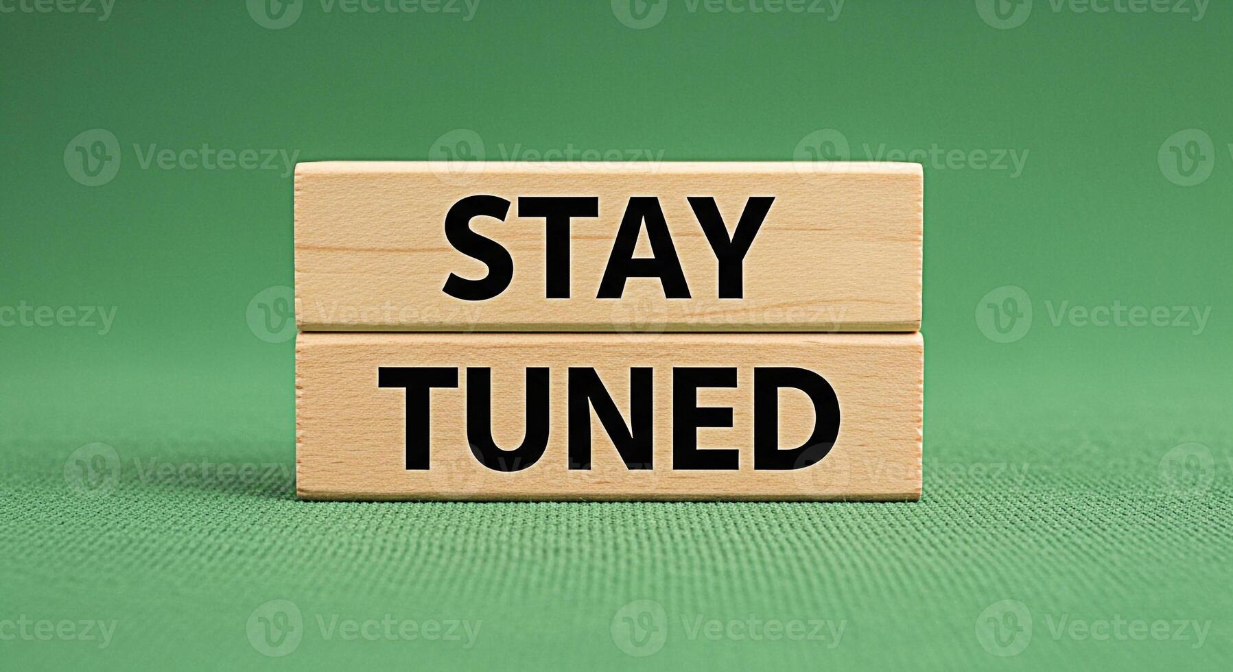 Wooden blocks stacked on a green surface displaying the phrase Stay Tuned creating anticipation and excitement for an upcoming announcement or event inviting viewers to remain attentive and engaged Pro Photo