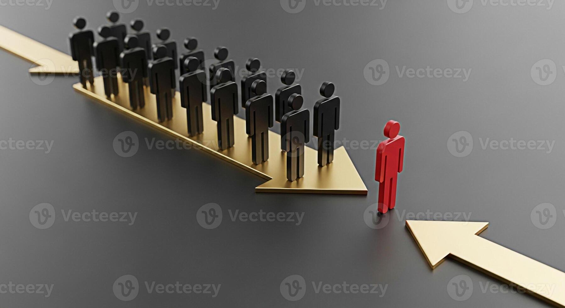 A group of black figures moving forward on a golden arrow while a single red figure stands apart on a gray background symbolizing leadership individuality and a different path to success Pro Photo