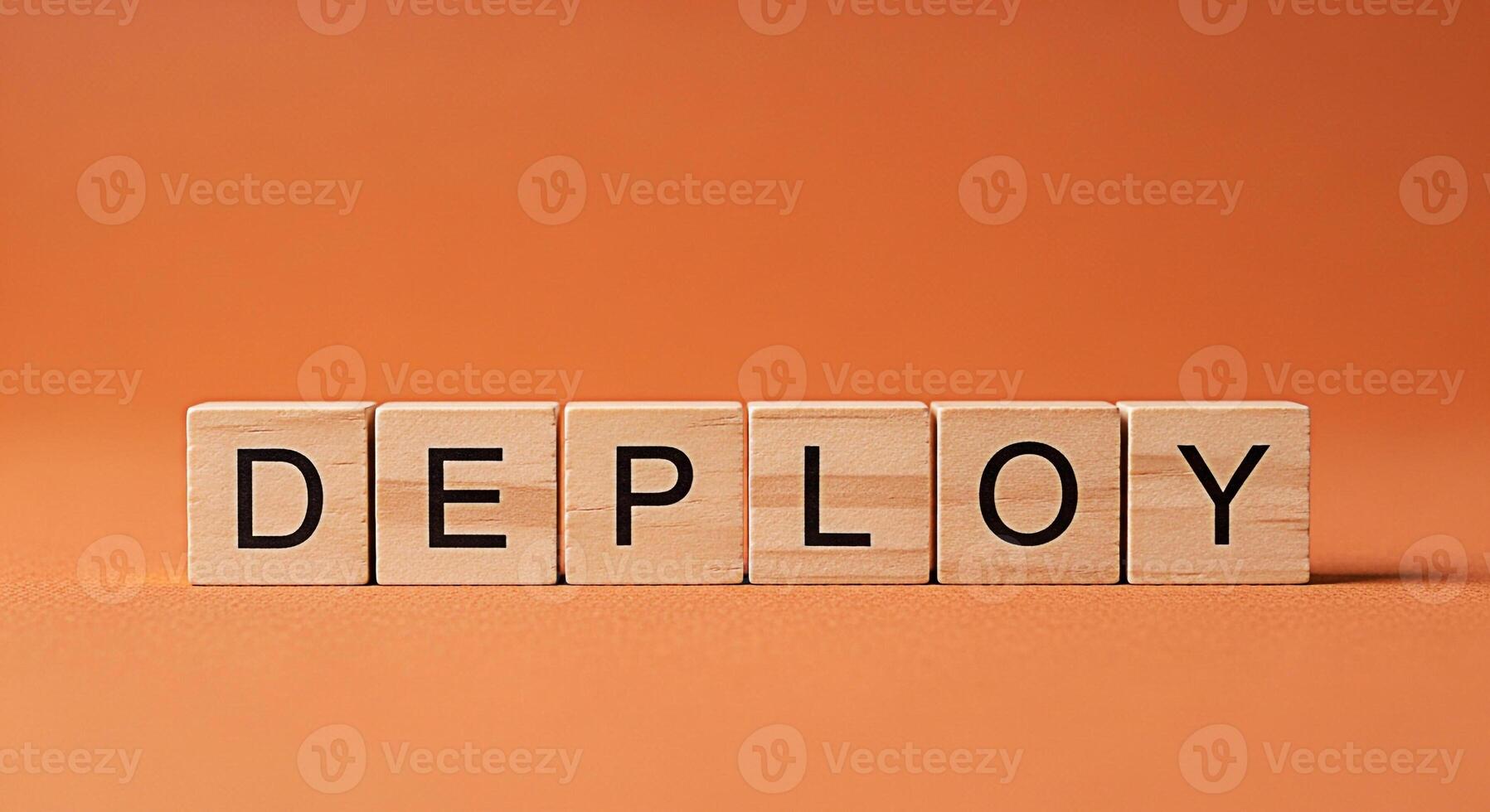 Wooden blocks spelling DEPLOY on a textured orange surface symbolizing implementation and release in a clean studio setting conveying a sense of readiness and strategic execution for business and tech Pro Photo