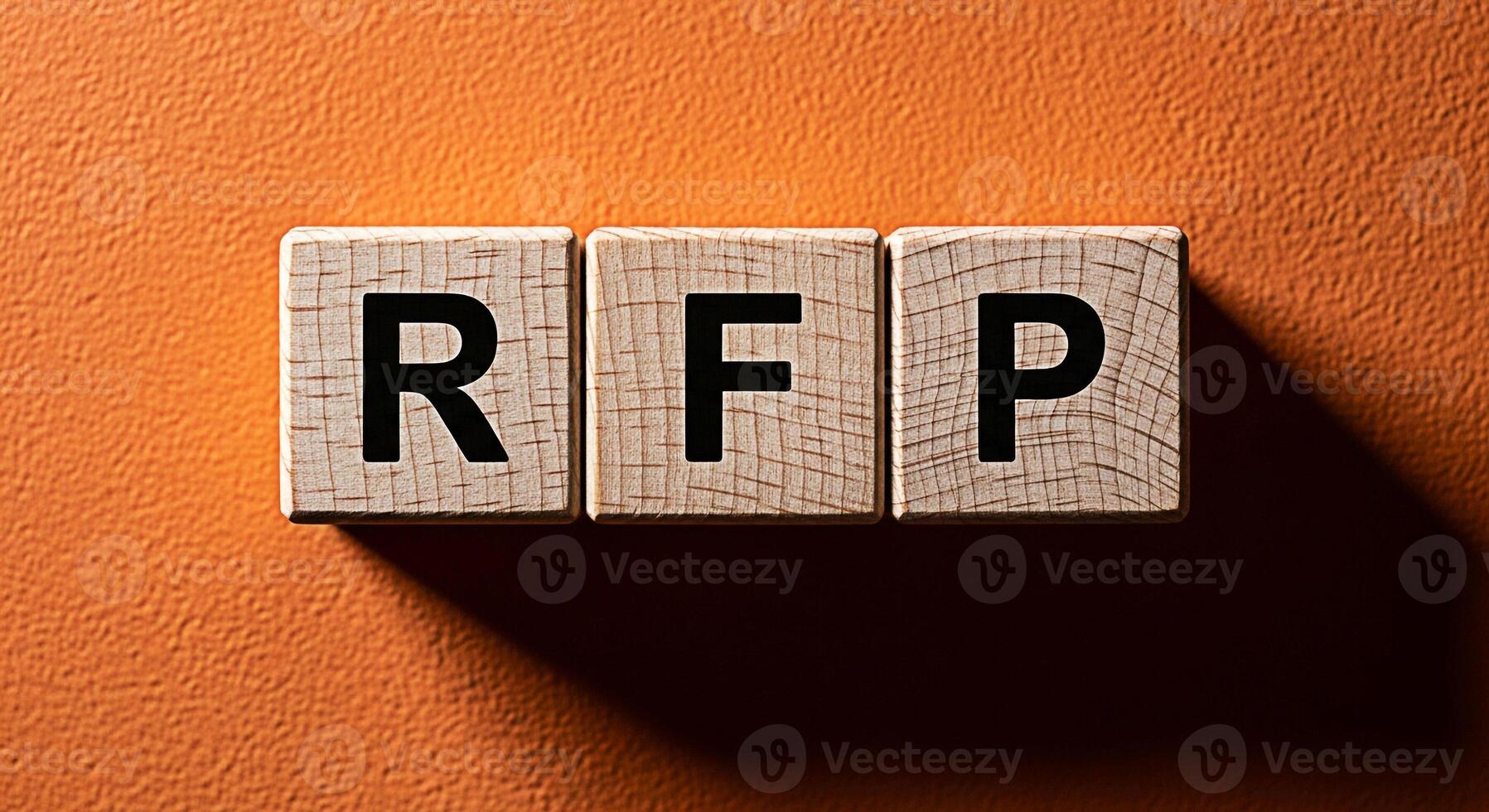 Wooden blocks displaying RFP on a textured orange background representing a request for proposal inviting bids and offers fostering transparency and competition in procurement processes Pro Photo