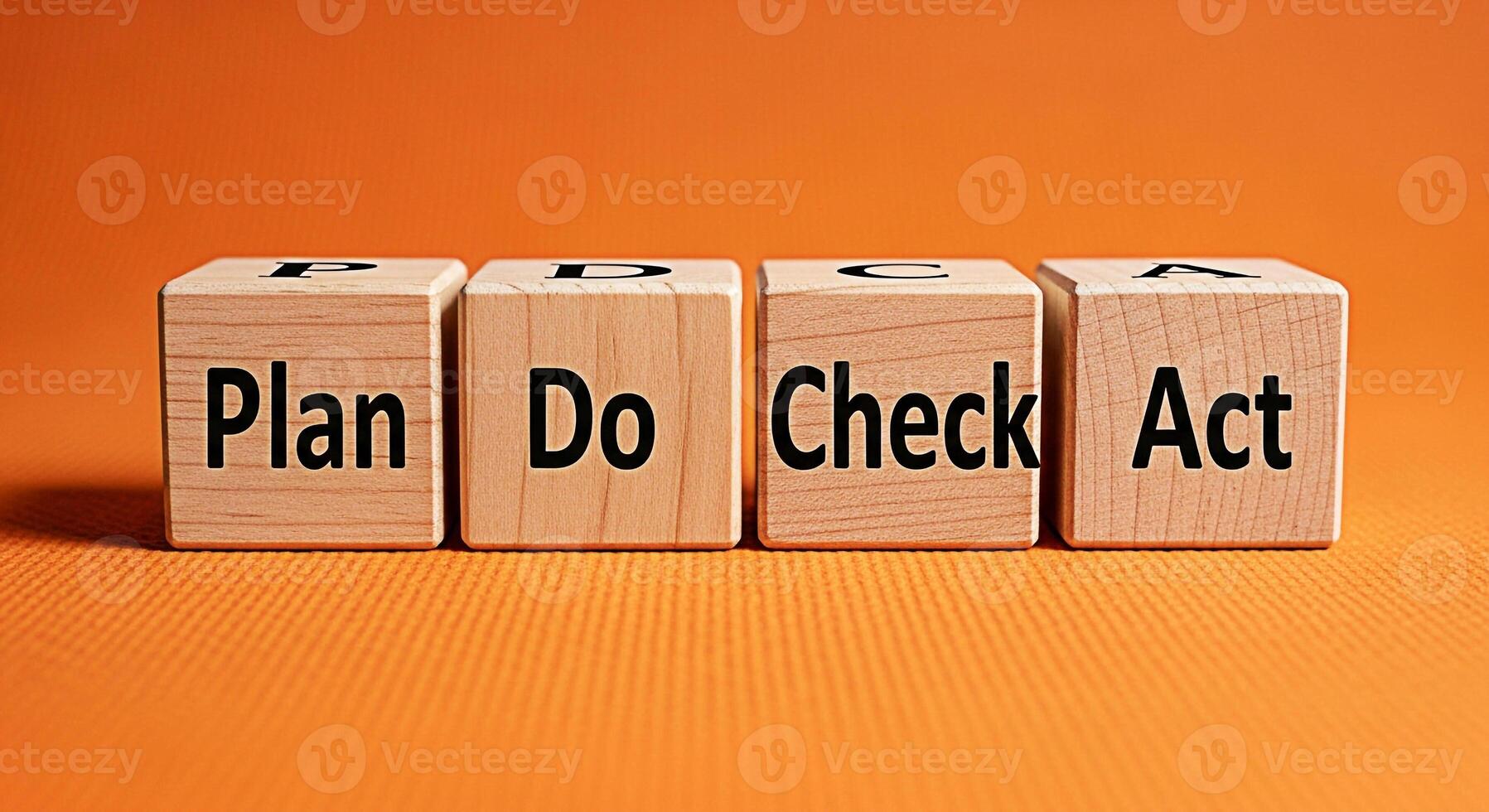 Wooden blocks displaying Plan Do Check Act on an orange surface illustrating the iterative fourstep management method used in business for the control and continuous improvement of processes and produ Pro Photo