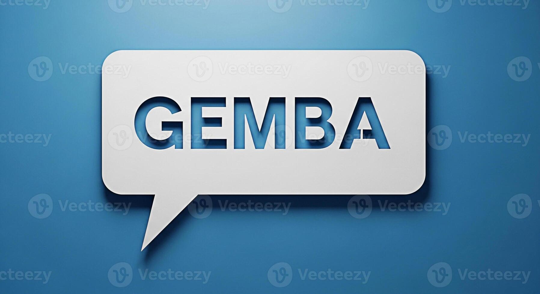 The word GEMBA cut out of a white speech bubble against a blue background representing a lean manufacturing concept and promoting workplace improvement and problemsolving strategies in a visually enga Pro Photo