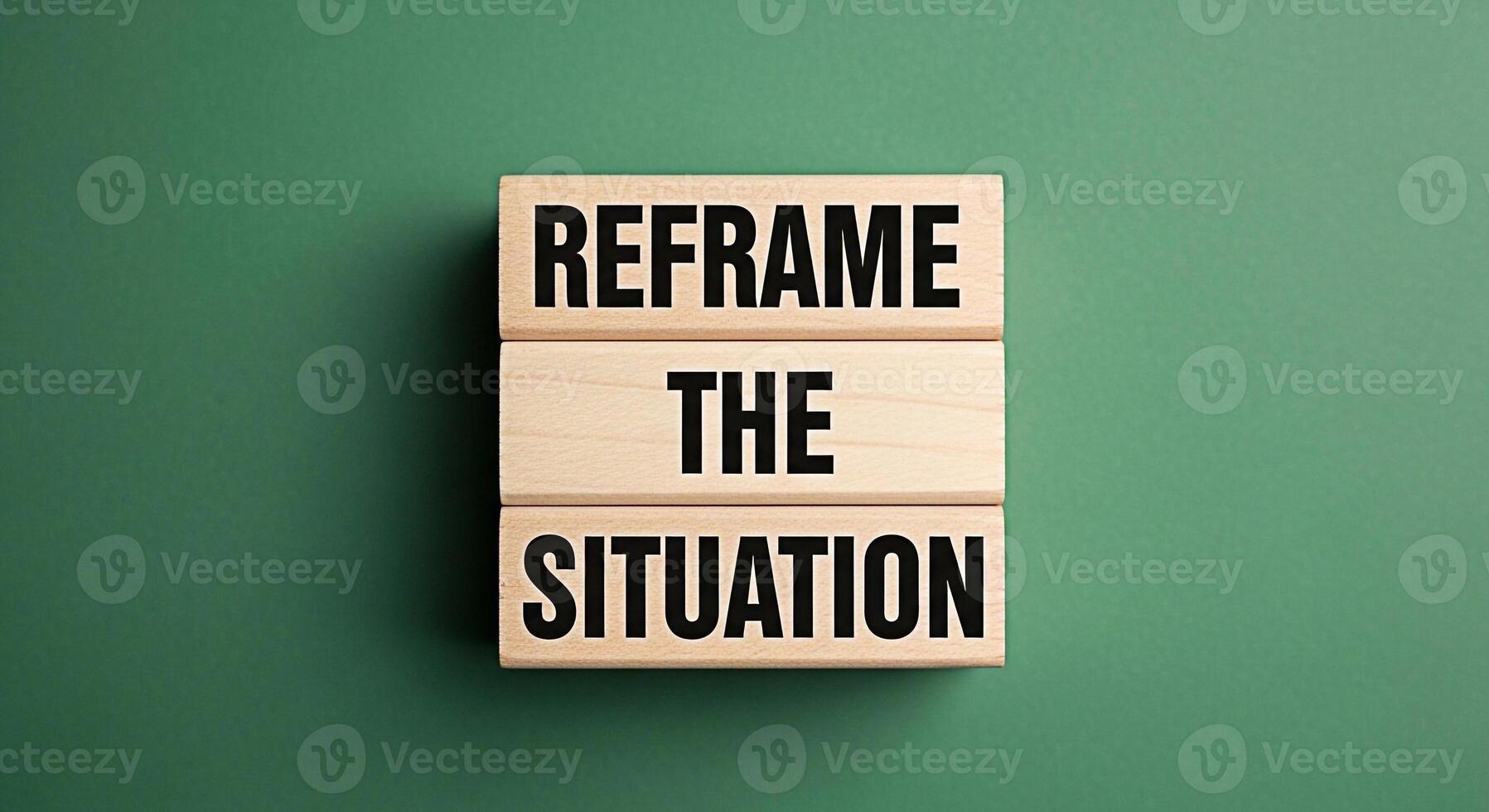 Wooden blocks spelling Reframe The Situation on a green background suggesting a need for a new perspective and a positive mindset to overcome challenges and find opportunities in difficult circumstanc Pro Photo