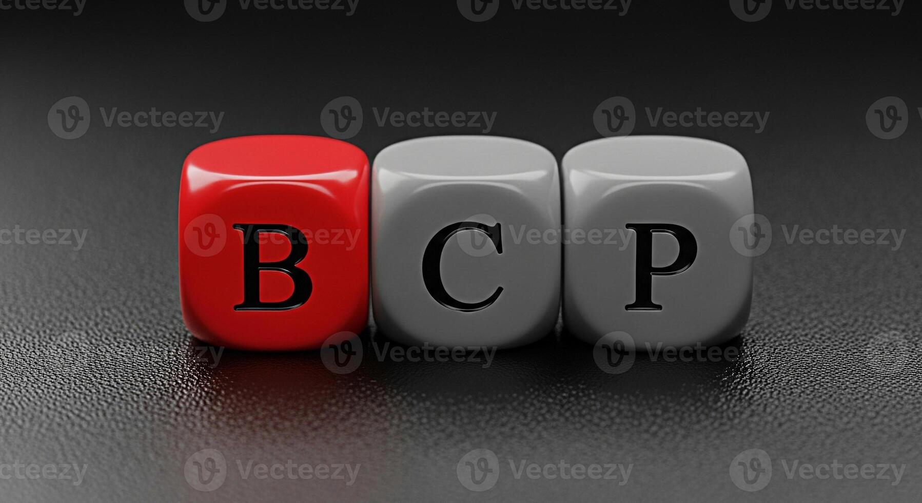 Three dice displaying BCP on a textured dark surface representing Business Continuity Planning highlighting the importance of strategic planning and risk management for organizational resilience and s Pro Photo