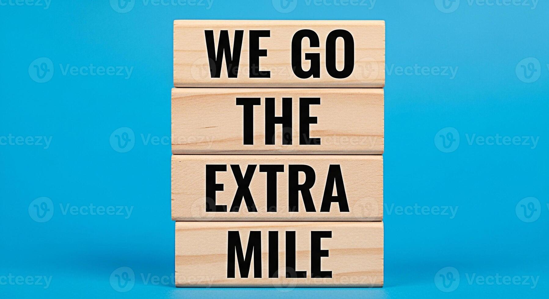 Wooden blocks stacked on a blue background displaying the message We go the extra mile representing dedication commitment and exceeding expectations in a bright and optimistic setting symbolizing succ Pro Photo