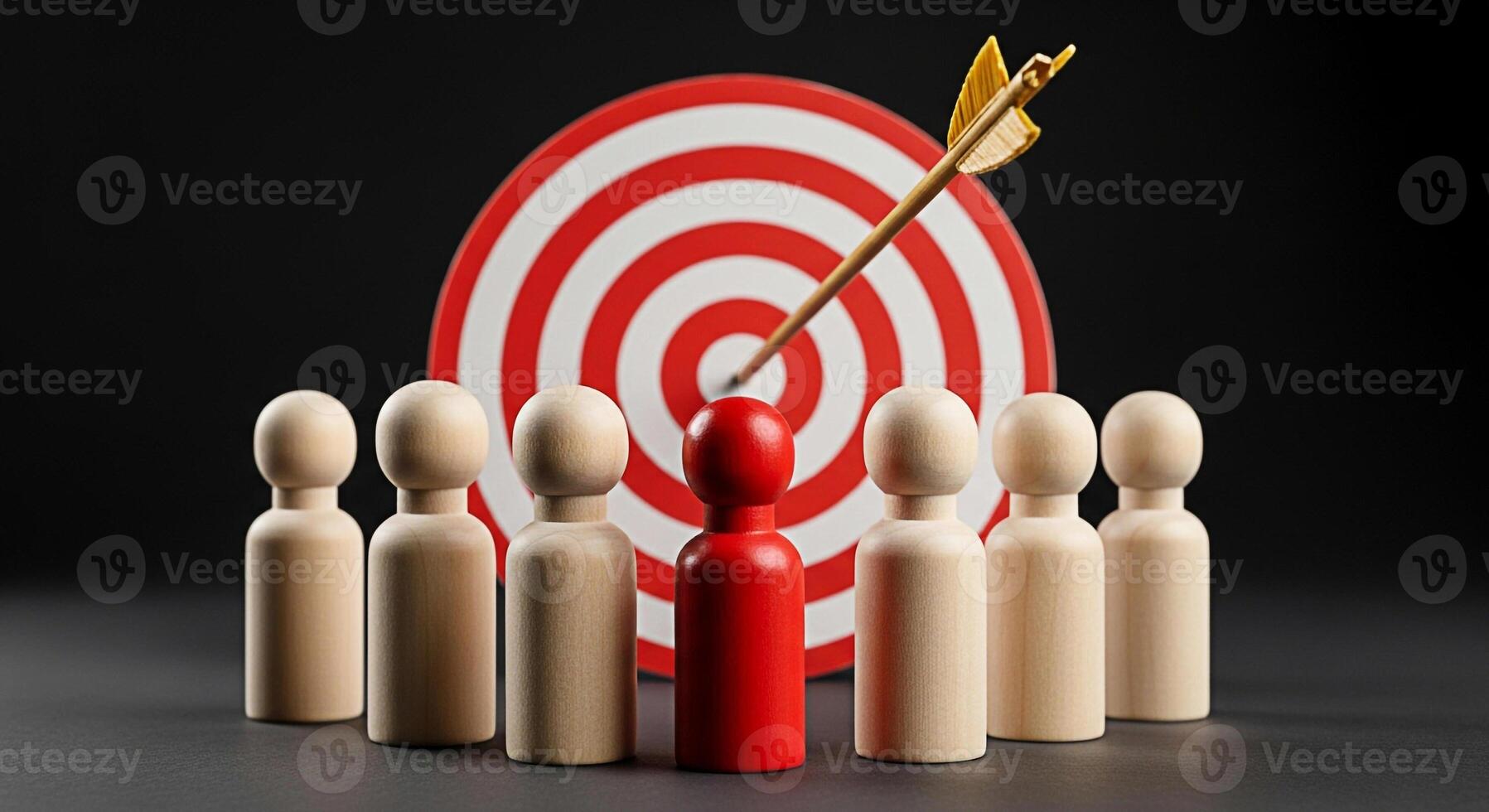Wooden figures standing in front of a target with an arrow symbolizing leadership and achieving goals in a competitive environment conveying a sense of focus and determination on a dark background Pro Photo