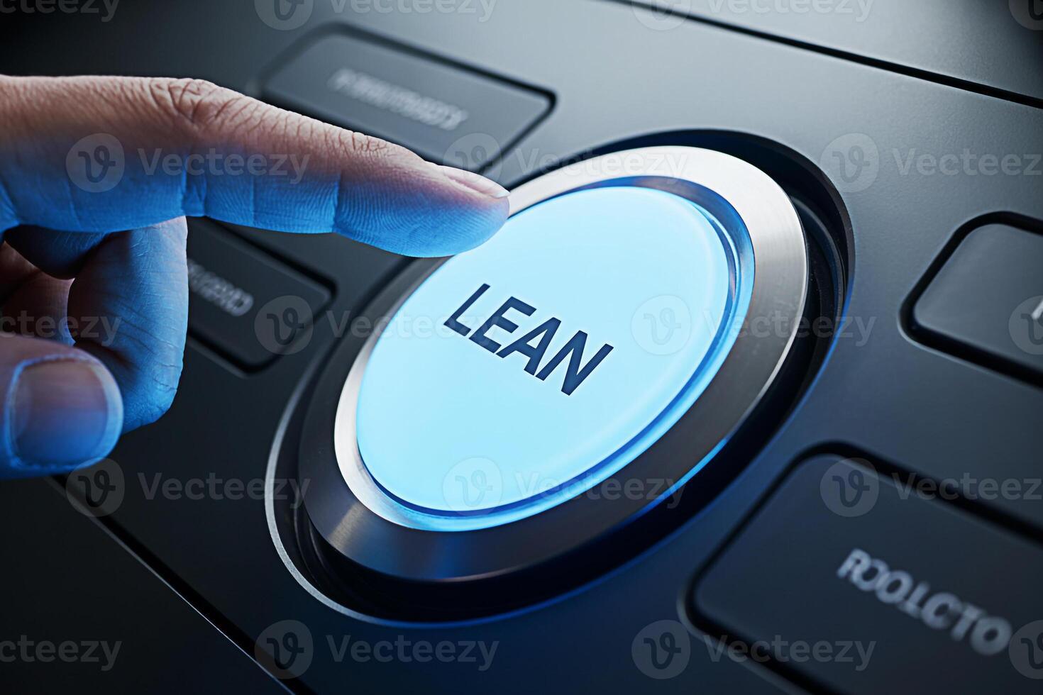 Closeup of a finger pressing a glowing blue LEAN button on a modern control panel symbolizing efficiency and streamlined processes in a business or manufacturing environment promoting operational exce Pro Photo