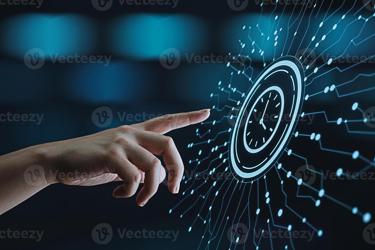 Human hand interacting with a digital clock interface in a futuristic environment symbolizing time management and technological advancement conveying a sense of control and efficiency in the digital a Pro Photo