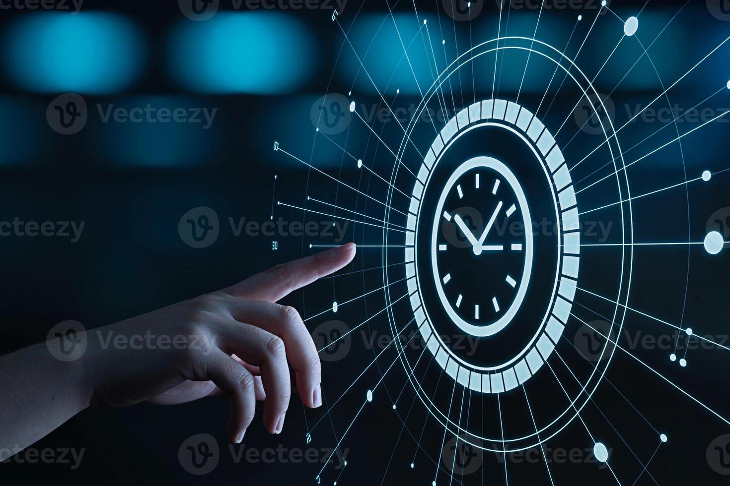 Human hand interacting with a digital clock interface on a futuristic screen symbolizing time management deadlines and the integration of technology in scheduling and productivity in a modern world Pro Photo