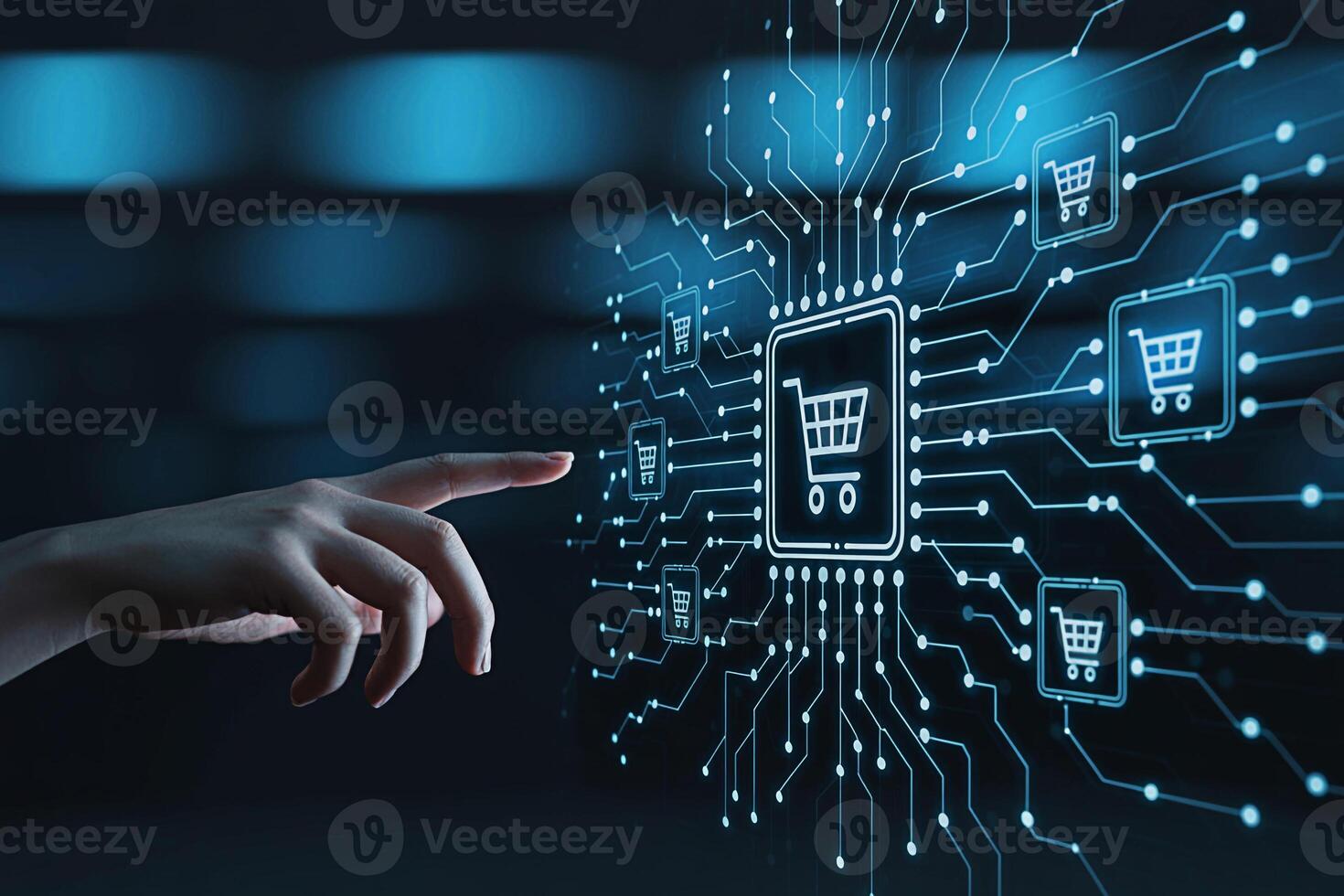 Human hand interacts with a digital interface displaying shopping cart icons symbolizing online retail and ecommerce in a futuristic technologically advanced environment conveying innovation and conve Pro Photo