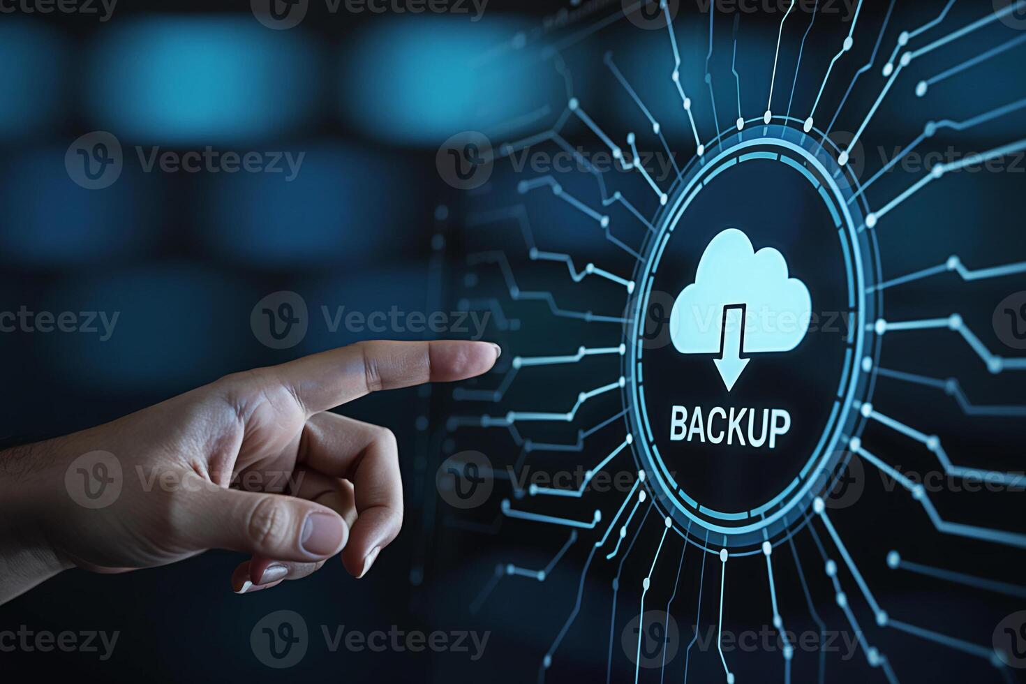 Human hand touching a digital screen displaying a cloud icon and the word BACKUP surrounded by circuit board patterns symbolizing data protection security and the importance of information backup in a Pro Photo