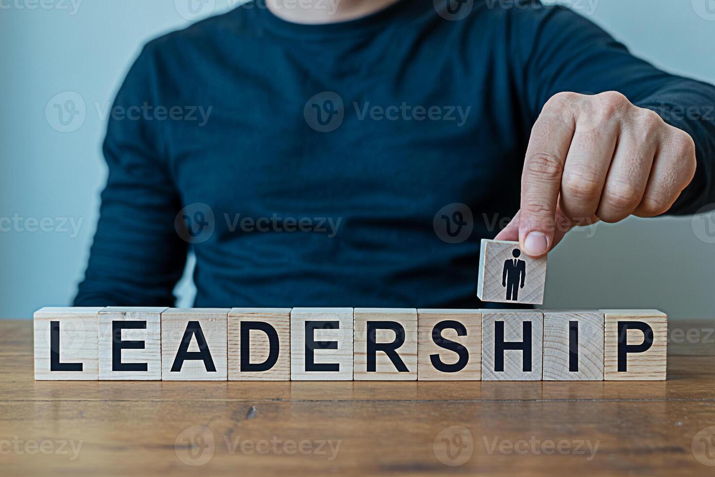 Man adding a wooden block with a person icon to the word LEADERSHIP spelled out with blocks on a wooden table symbolizing building strong leadership skills and a successful business team in a corporat Pro Photo