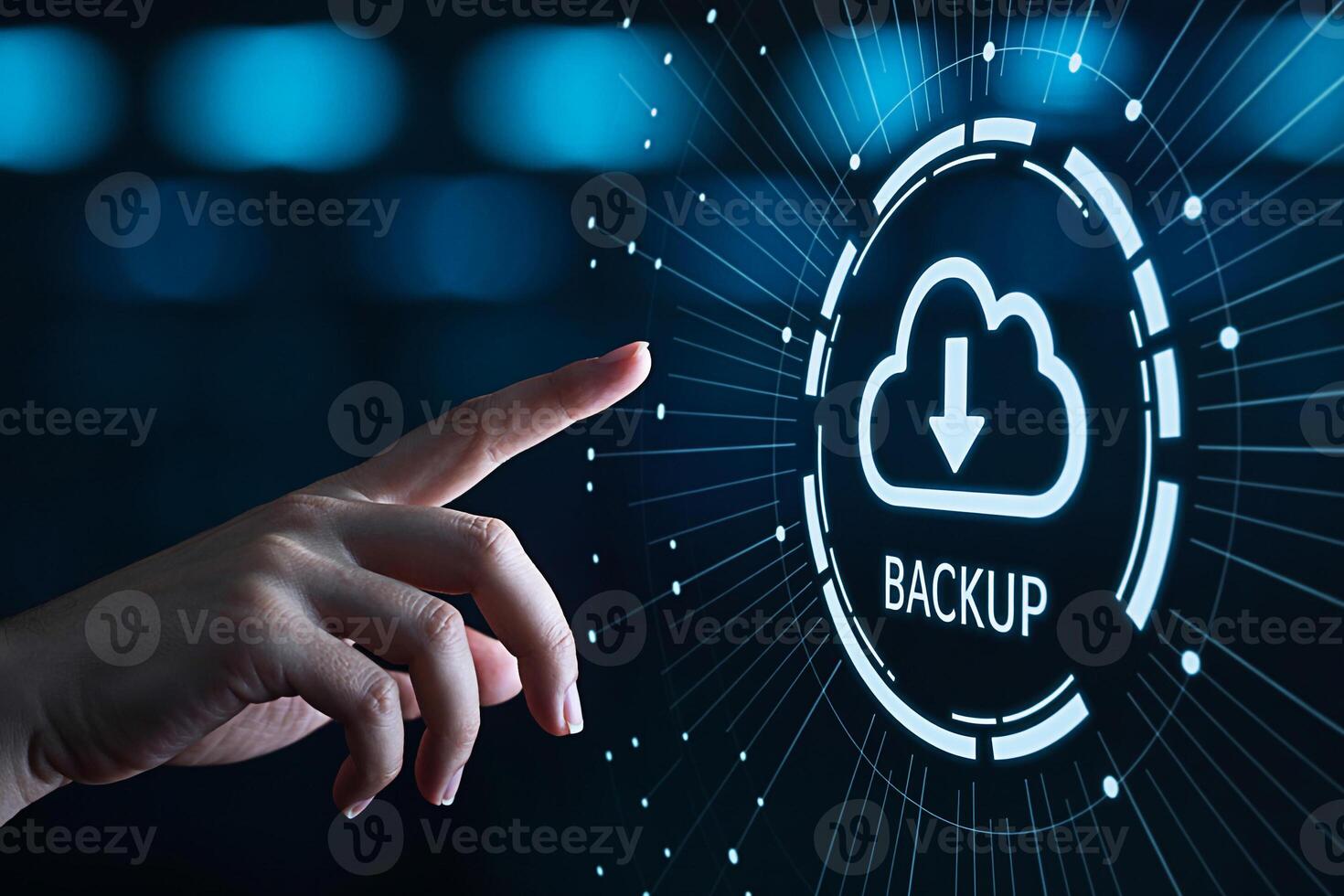 Human hand interacting with a digital interface featuring a cloud icon and the word BACKUP symbolizing data protection and recovery in a modern technologically advanced environment conveying a sense o Pro Photo
